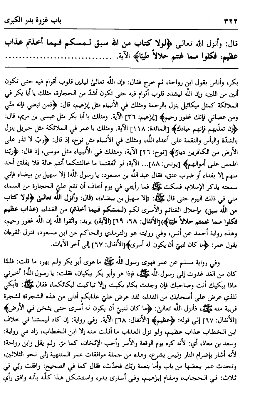 بكر، وأناس بقول ابن رواحة، ثم خرج فقال: "إن الله تعالى ليلين قلوب أقوام فيه حتى تكون ألين ن اللبن، وإن الله ليشدد قلوب أقوام فيه حتى تكون أشد من الحجارة، مثلك يا أبا بكر في الملائكة كمثل ميكائيل ينزل بالرحمة ومثلك في الأنبياء مثل إبراهيم، قال: {فَمَنْ تَبِعَنِي فَإِنَّهُ مِنِّي وَمَنْ عَصَانِي فَإِنَّكَ غَفُورٌ رَحِيم} [إبراهيم: 36] الآية. ومثلك يا أبا بكر مثل عيسى بن مريم، قال: {إِنْ تُعَذِّبْهُمْ فَإِنَّهُمْ عِبَادُكَ} [المائدة: 118] الآية. ومثلك يا عمر في الملائكة مثل جبريل ينزل بالشدة والبأس والنقمة على أعداء الله، ومثلك في الأنبياء مثل نوح، إذ قال: {رَبِّ لَا تَذَرْ عَلَى الْأَرْضِ مِنَ الْكَافِرِينَ دَيَّارًا} [نوح: 26] الآية، ومثلك في الأنبياء مثل موسى، إذ قال: {رَبَّنَا اطْمِسْ عَلَى أَمْوَالِهِمْ} [يونس: 88] الآية، لو اتفقتما ما خالفتكما أنتم عالة فلا يفلتن أحد منهم إلا بفداء أو ضرب عنق"، فقال عبد الله بن مسعود: يا رسول الله! إلا سهيل بن بيضاء فإني سمعته يذكر الإسلام، فسكت صلى الله عليه وسلم فما رأيتني في يوم أخاف أن تقع علي الحجارة من السماء مني في ذلك اليوم حتى قال صلى الله عليه وسلم: "إلا سهيل بن بيضاء" "قال: وأنزل الله تعالى: {لَوْلَا كِتَابٌ مِنَ اللَّهِ سَبَق} بإحلال الغنائم والأسرى لكم {لَمَسَّكُمْ فِيمَا أَخَذْتُمْ} من الفداء {عَذَابٌ عَظِيمٌ، فَكُلُوا مِمَّا غَنِمْتُمْ حَلَالًا طَيِّبًا} [الأنفال: 68، 69] "الآية" يريد: واتقوا الله إن الله غفور رحيم، وهذه رواية أحمد عن أنس، وفي روايته وهو الترمذي والحاكم عن ابن مسعود، فنزل القرآن بقول عمر: {مَا كَانَ لِنَبِيٍّ أَنْ يَكُونَ لَهُ أَسْرَى} [الأنفال: 67] إلى آخهر الآيات.