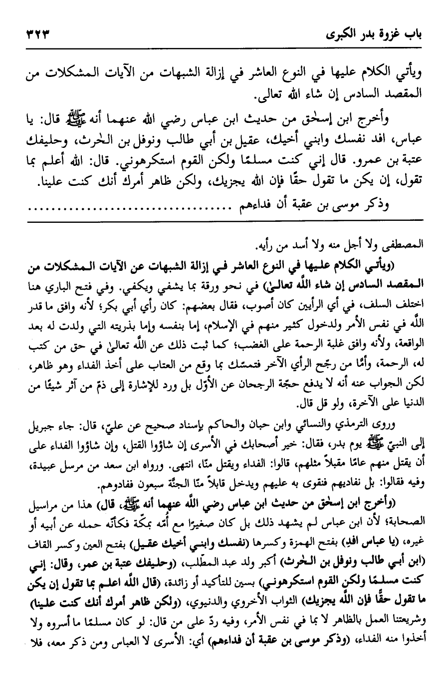 "ويأتي الكلام عليها في النوع العاشر في إزالة الشبهات عن الآيات المشكلات من المقصد السادس إن شاء الله تعالى" في نحو ورقة بما يشفي ويكفي. وفي فتح الباري هنا اختلف السلف، في أي الرأيين كان أصوب، فقال بعضهم: كان رأي أبي بكر؛ لأنه وافق ما قدر الله في نفس الأمر ولدخول كثير منهم في الإسلام، إما بنفسه وإما بذريته التي ولدت له بعد الواقعة، ولأنه وافق غلبة الرحمة على الغضب، كما ثبت ذلك عن الله تعالى في حق من كتب له، الرحمة, وأما من رجح الرأي الآخر فتمسك بما وقع من العتاب على أخذ الفداء وهو ظاهر، لكن الجواب عنه أنه لا يدفع حجة الرجحان عن الأول بل ورد للإشارة إلى ذم من آثر شيئا من الدنيا على الآخرة، ولو قل قال.