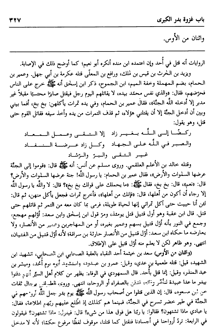 "واثنان من الأوس" سعدبن خيثمة أحد النقباء بالعقبة الصحابي ابن الصحابي، الشهيد ابن الشهيد، قيل: قتله طعمية بن عدي، وقيل: عمرو بن عبدود، واستشهد أبوه يوم أحد، ومبشر بن عبد المنذر، وقيل: إنما قتل بأحد. قال السمهودي في الوفاء: يظهر من كلام أهل السير أنهم دفنوا ببدر ما عدا عبيدة لتأخر وفاته، فدفن بالصفراء أو الروحاء، انتهى. وروى الطبراني برجال ثقات عن ابن مسعود، قال: إن الذين قتلوا من أصحاب رسول الله صلى الله عليه وسلم يوم بدر جعل الله أرواحهم في الجنة في طير خضر تسرح في الجنة، فبينما هم كذلك إذ طلع عليهم ربهم اطلاعه، فقال: يا عبادي ماذا تشتهون؟ فقالوا: يا ربنا هل فوق هذا من شيء؟ قال: فيقول: ماذا تشتهون؟ فيقولون في الرابعة: ترد أرواحنا في أجسادنا فنقتل كما قتلنا، موقوف لفظا مرفوع حكما؛ لأنه لا مدخل