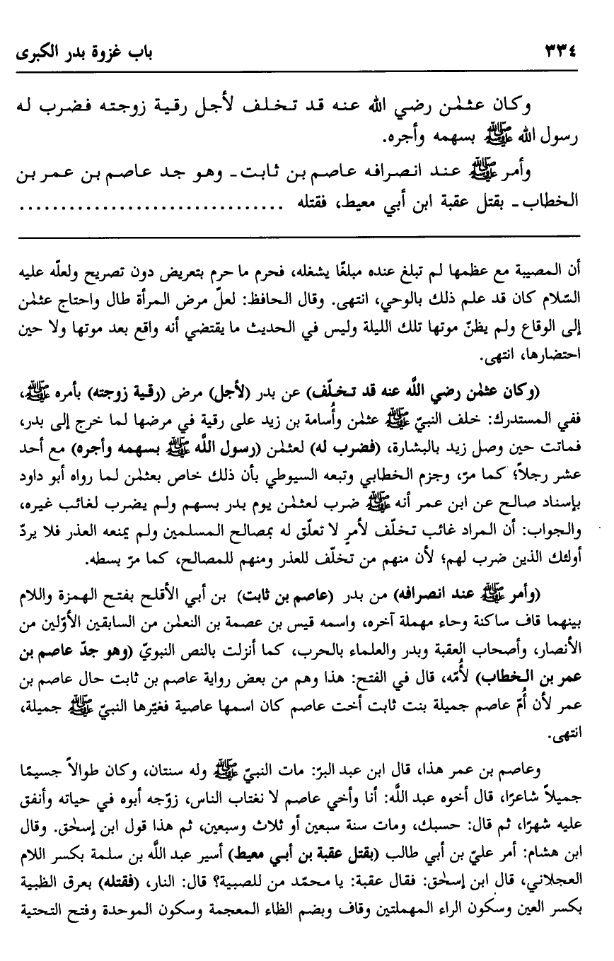 وأمر صلى الله عليه وسلم عند انصرافه عاصم بن ثابت -وهو جد عاصم بن عمر بن الخطاب- بقتل عقبة بن أبي معيط، فقتله........................................................................