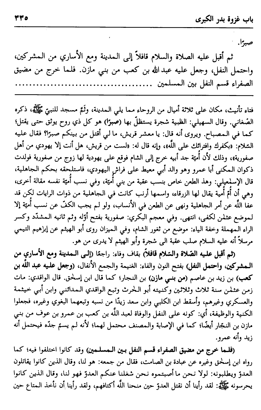 ثم أقبل عليه الصلاة والسلام قافلا إلى المدينة ومع الأساري من المشركين، واحتمل النفل، وجعل عليه عبد الله بن كعب من بني مازن. فلما خرج من مضيق الصفراء قسم النفل بين المسلمين...........................................................