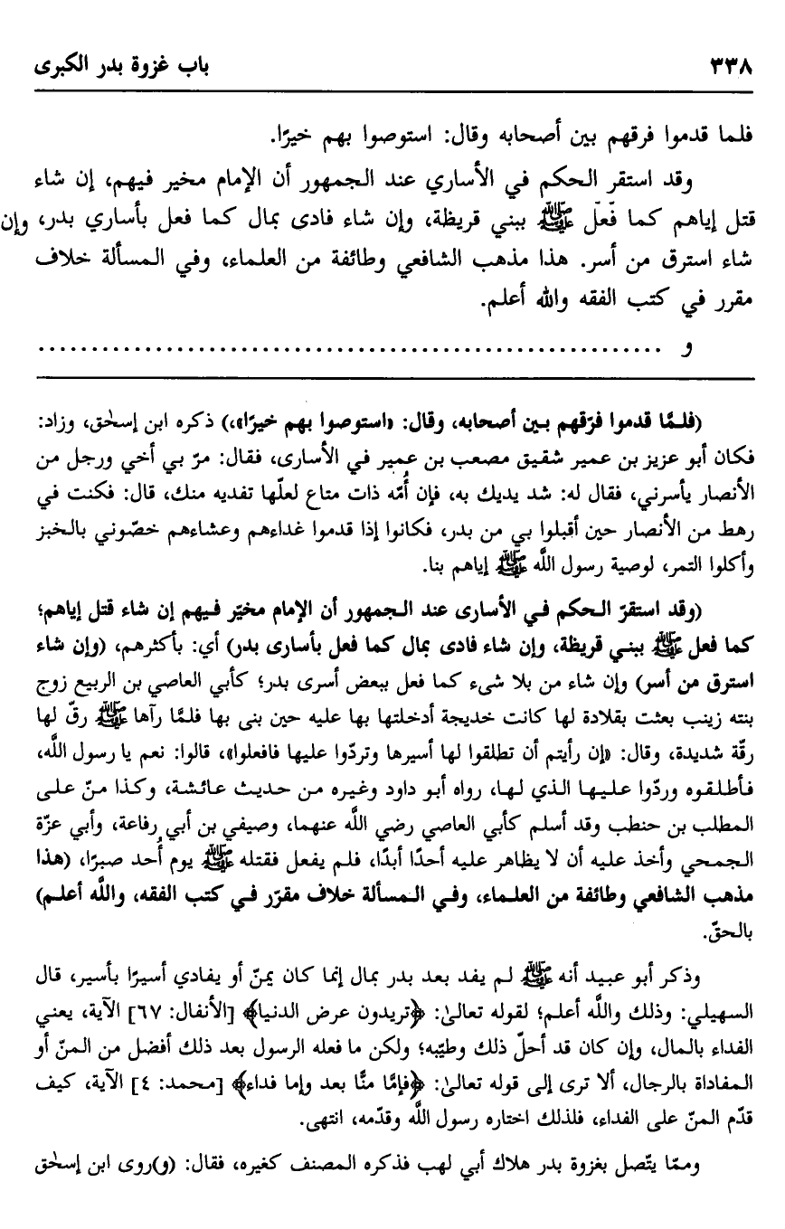 "وقد استقر الحكم في الأسارى عند الجمهور أن الإمام مخير فيهم إن شاء قتل إياهم، كما فعل صلى الله عليه وسلم ببني قريظة، وإن شاء فادى بمال كما فعل ببعض أسرى بدر، كأبي العاصي بن الربيع زوج بنته زينب بعثت بقلادة لهاكانت خديجة أدخلتها بها عليه حين بنى بها فلما رآها صلى الله عليه وسلم رق لها رقة شديدة، وقال: "إن رأيتم أن تطلقوا لها أسيرها وتردوا عليها فافعلوا"، قالوا: نعم يا رسول الله، فأطلقوه وردوا عليها الذي لها، رواه أبو داود وغيره من حديث عائشة، وكذا من على المطلب بن حنطب وقد أسلم كأبي العاصي رضي الله عنهما، وصيفي بن أبي رفاعة، وأبي عزة الجمحي وأخذ عليه أن لا يظاهر عليه أحدًا أبدا، فلم يفعل فقتله صلى الله عليه وسلم يوم أحد صبرا، "هذا مذهب الشافعي وطائفة من العلماء، وفي المسألة خلاف مقرر في كتب الفقه، والله أعلم" بالحق.