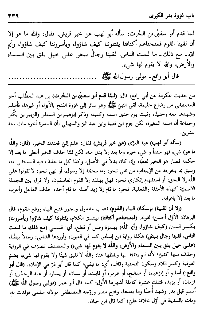 "إلا أن لقينا" بإسكان الياء "القوم" نصب مفعول ويجوز فتح الياء ورفع القوم، قال البرهان: الأول أحسن، لقوله: فمنحناهم أكتافنا" لينتسق الكلام، يقتلوننا كيف شاءوا ويأسروننا" بكسر السين "كيف شاءوا، وايم الله" بهمزة وصل أو قطع، أي: قسمي "مع ذلك ما لمت الناس، لقينا رجال بيض" هكذا رواية ابن إسحاق كما في العيون، وأوردها الشامي: رجالا بيضا، "على خيل بلق بين السماء والأرض، والله لا يقوم لها شيء" والمصنف تصرف في الرواية وحذف منها كثيرا؛ لأنه لم يتقيد بها ولفظها هنا: والله لا تليق شيئا ولا يقوم لها شيء، بضم الفوقية وكسر اللام وسكون التحتية وقاف، أي: ما تبقي، كما قال أبو ذر في الإملاء. "قال أبو رافع:" أسلم أو إبراهيم، أو صالح، أو هرمز، أو ثابت، أو سنان، أو يسار، أو عبد الرحمن، أو قزمان، أو يزيد، فتلك عشرة كاملة أشهرها الأول، كما قال أبو عمر "مولى رسول الله صلى الله عليه وسلم" أسلم قبل بدر وشهد أحدًا وما بعدها، وفتح مصر وزوجه المصطفى مولاته سلمى فولدت له، ومات بالمدينة في أول خلافة علي، كما قال ابن حبان.