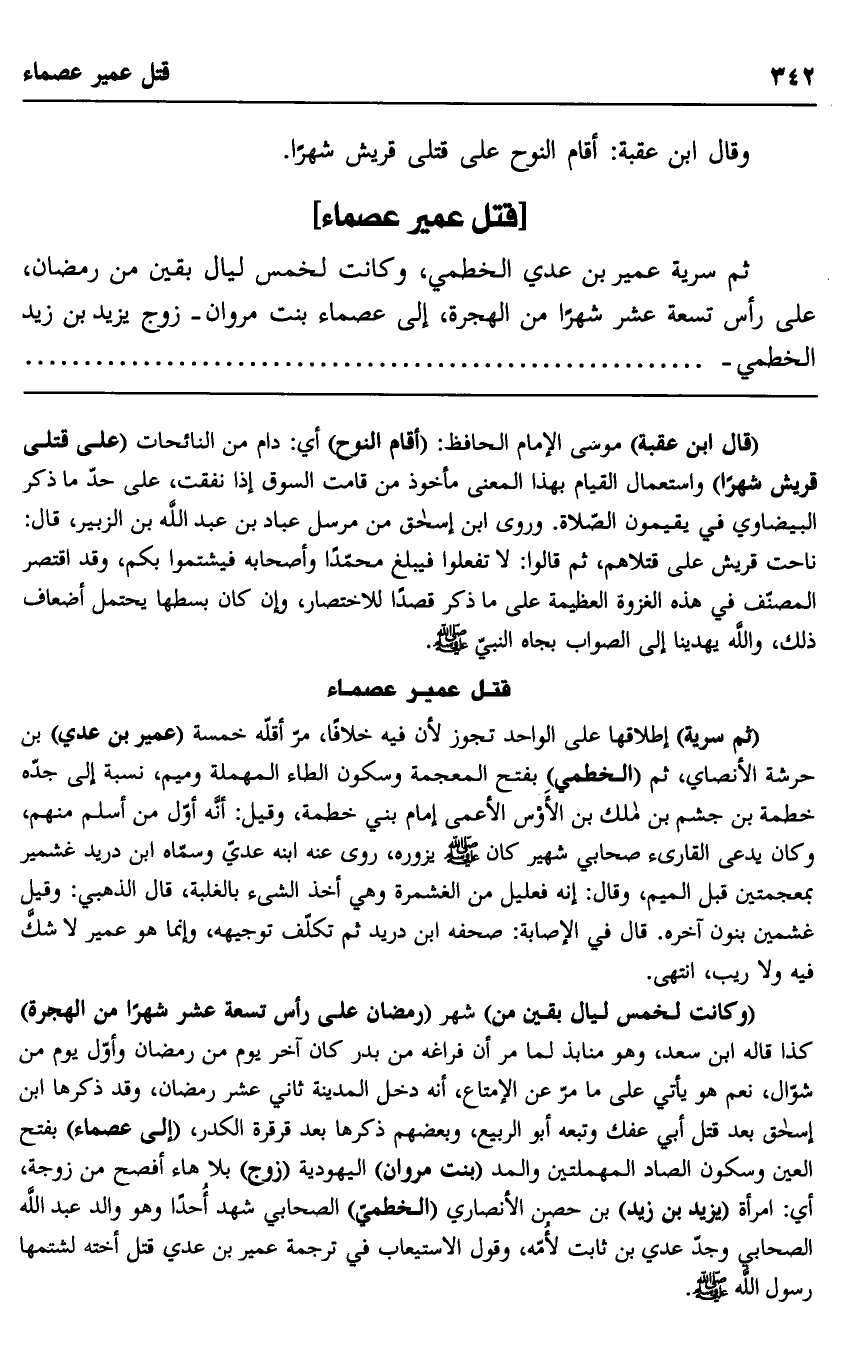 "وكانت لخمس ليال بقين من" شهر "رمضان على رأس تسعة عشر شهرا من الهجرة" كذا قاله ابن سعد، وهو منابذ لما مر أن فراغه من بدر كان آخر يوم من رمضان وأول يوم من شوال، نعم هو يأتي على ما مر عن الإمتاع، أنه دخل المدينة ثاني عشر رمضان، وقد ذكره ابن إسحاق بعد قتل أبي عفك وتبعه أبو الربيع، وبعضهم ذكرها بعد قرقرة الكدر، "إلى عصماء" بفتح العين وسكون الصاد المهملتين والمد "بنت مروان" اليهودية "زوج" بلا هاء أفصح من زوجة، أي: امرأة يزيد بن زيد" بن حصن الأنصاري "الخطمي" الصحابي شهد أحدا وهو والد عبد الله الصحابي وجد عدي بن ثابت لأمه، وقول الاستيعاب في ترجمة عمير بن عدي قتل أخته لشتمها رسول الله صلى الله عليه وسلم.