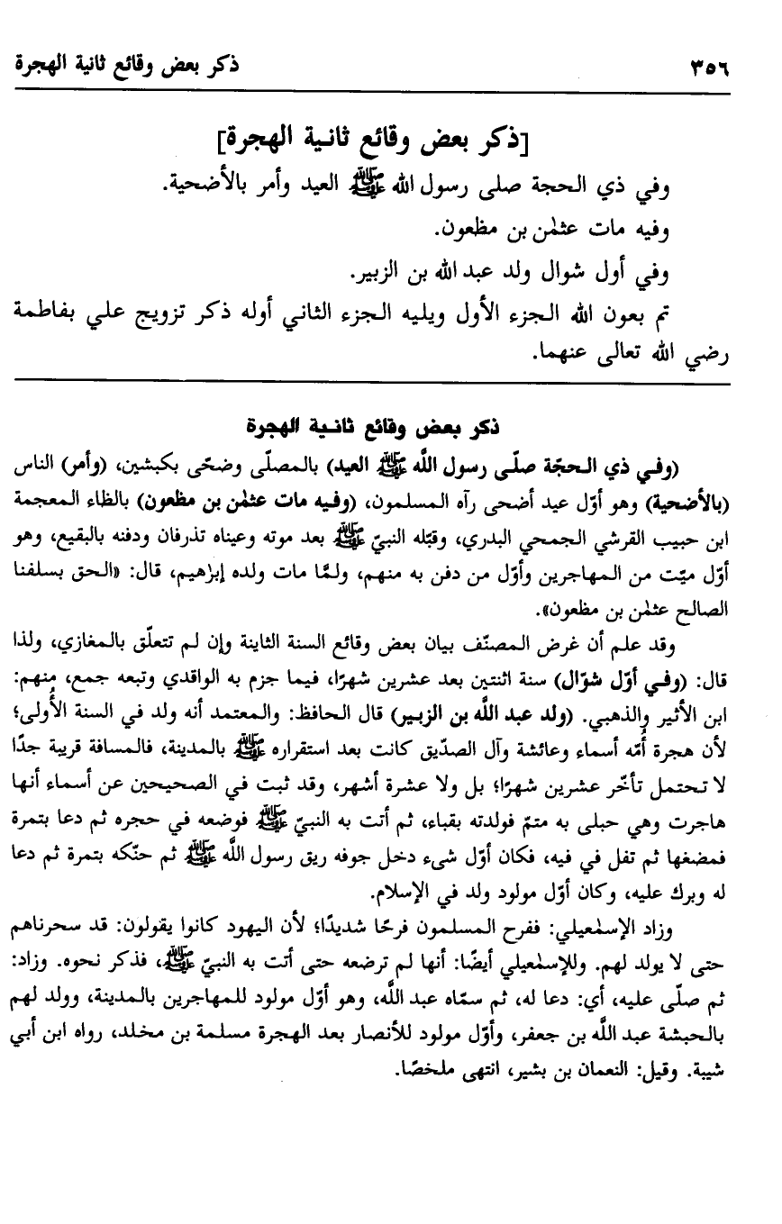 وقد علم أن غرض المصنف بيان بعض وقائع السنة الثانية وإن لم تتعلق بالمغازي، ولذا قال: "وفي أول شوال" سنة اثنتين بعد عشرين شهرا، فيما جزم به الواقدي وتبعه جمع، منهم: ابن الأثير والذهبي. "ولد عبد الله بن الزبير" قال الحافظ: والمعتمد أنه ولد في السنة الأولى؛ لأن هجرة أمه أسماء وعائشة وآل الصديق كانت بعد استقراره صلى الله عليه وسلم بالمدينة، فالمسافة قريبة جدا لا تحتمل تأخر عشرين شهرا، بل ولا عشرة أشهر، وقد ثبت في الصحيحين عن أسماء أنها هاجرت وهي حبلى به متم فولدته بقباء، ثم أتت به النبي صلى الله عليه وسلم فوضعه في حجره ثم دعا بتمرة فمضغها ثم تفل في فيه، فكان أول شيء دخل جوفه ريق رسول الله صلى الله عليه وسلم ثم حنكه بتمرة ثم دعا له وبرك عليه، وكان أول مولود ولد في الإسلام.