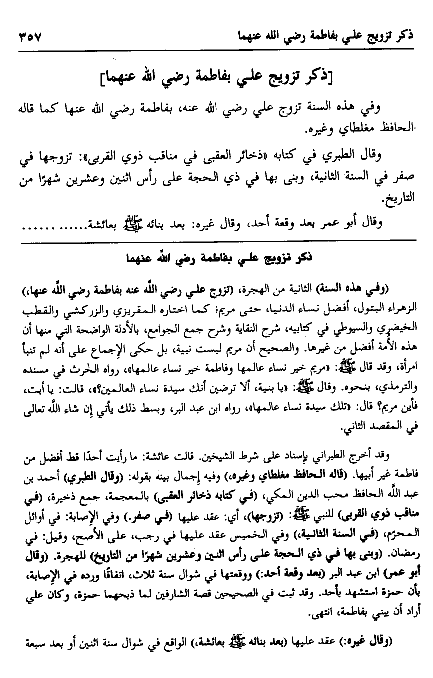 "وفي هذه السنة" الثانية من الهجرة، "تزوج علي رضي الله عنه بفاطمة رضي الله عنها" الزهراء البتول، أفضل نساء الدنيا، حتى مريم، كما اختاره المقريزي والزركشي والقطب الخيضري والسيوطي في كتابيه، شرح النقاية وشرح جمع الجوامع، بالأدلة الواضحة التي منها أن هذه الأمة أفضل من غيرها. والصحيح أن مريم ليست نبية، بل حكي الإجماع على أنه لم تنبأ امرأة، وقد قال صلى الله عليه ولسلم: "مريم خبير نساء عالمها وفاطمة خير نساء عالمها"، رواه الحارث في مسنده والترمذي، بنحوه. وقال صلى الله عليه وسلم: "يا بنية، ألا ترضين أنك سيدة نساء العالمين"؟، قالت: يا أبت، فأين مريم؟ قال: "تلك سيدة نساء عالمها"، رواه ابن عبد البر، وبسط ذلك يأتي إن شاء الله تعالى في المقصد الثاني.