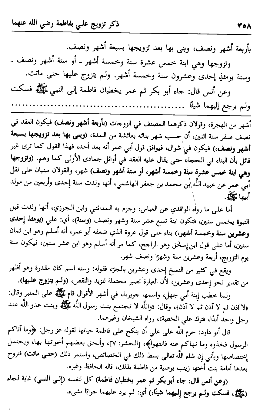 قال أبو داود: حرم الله على علي أن ينكح على فاطمة حياتها لقوله عز وجل: {وَمَا آتَاكُمُ الرَّسُولُ فَخُذُوهُ وَمَا نَهَاكُمْ عَنْهُ فَانْتَهُوا} ، [الحشر: 7] ، وألحق بعضهم أخواتها بها، ويحتمل اختصاصها ويأتي إن شاء الله تعالى بسط ذلك في الخصائص، واستمر ذلك "حتى ماتت" فتزوج بعدها أمامة بنت أختها زينب بوصية من فاطمة بذلك، قاله الحافظ وغيره.