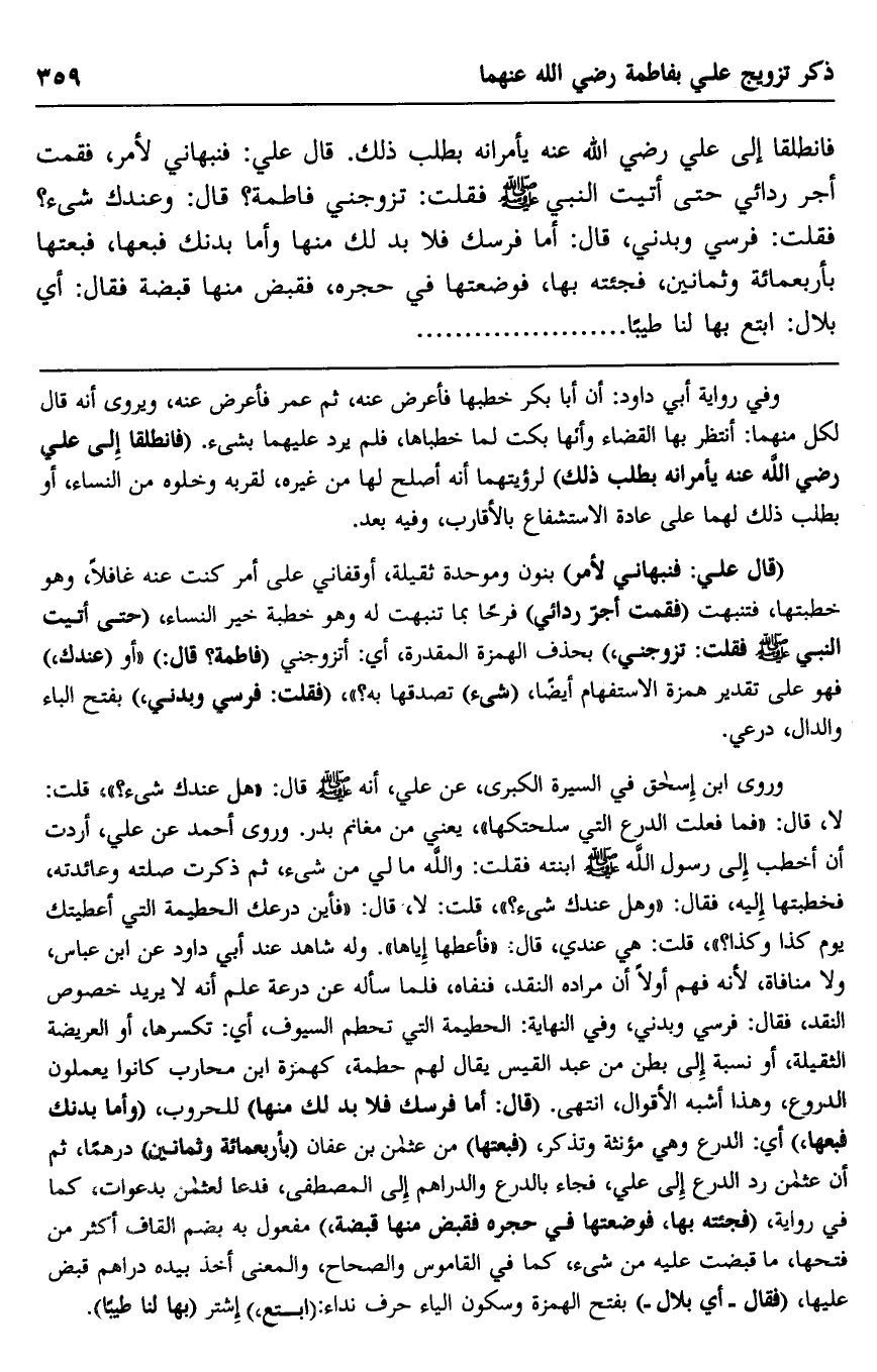 فانطلقا إلى علي رضي الله عنه يأمرانه بطلب ذلك. قال علي: فنبهاني لأمر، فقمت أجر ردائي حتى أتيت النبي صلى الله عليه وسلم فقلت: تزوجني فاطمة؟ قال: "وعندك شيء"؟ فقلت: فرسي وبدني، قال: "أما فرسك فلا بد لك منها وأما بدنك فبعها"، فبعتها بأربعمائة وثمانين، فجئته بها، فوضعتها في حجره، فقبض منها قبضة فقال: "أي بلال: ابتع بها لنا طيبا"