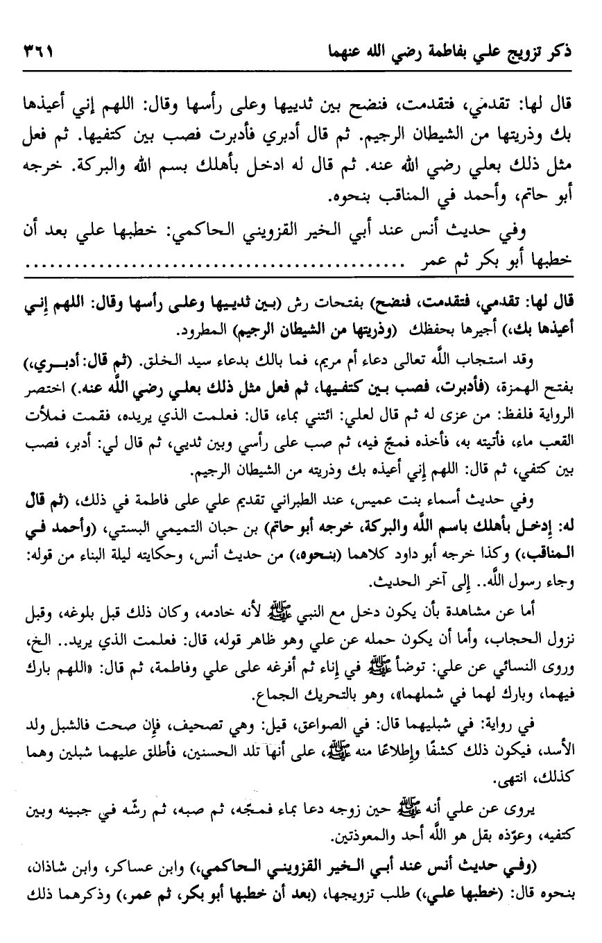 قال لها: "تقدمي"، فتقدمت: فنضح بين ثديها وعلى رأسها وقال: " اللهم إني أعيذها بك وذريتها من الشيطان الرجيم". ثم قال: "أدبري" فأدبرت فصب بين كتفيها. ثم فعل مثل ذلك بعلي رضي الله عنه. ثم قال له: "ادخل بأهلك بسم الله والبركة". خرجه أبو حاتم، وأحمد في المناقب بنحوه.
