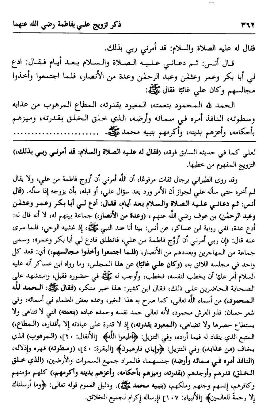 وقد روى الطبراني برجال ثقات مرفوعا، "أن الله أمرني أن أزوج فاطمة من علي"، ولا يقال لم أخره حتى سأله علي لجواز أن الأمر ورد بعد سؤال علي، أو قبله بأن يزوجه إذا سأله. "قال أنس: ثم دعاني عليه الصلاة والسلام بعد أيام، فقال: "ادع لي أبا بكر وعمر وعثمان وعبد الرحمن" بن عوف رضي الله عنهم، "وعدة من الأنصار" جماعة بينهم له، لا أنه قال له: أدع عدة، ففي رواية ابن عساكر، عن أنس: بينا أنا عند النبي صلى الله عليه وسلم؛ إذ غشيه الوحي، فلما سرى عنه قال: "إن ربي أمرني أن أزوج فاطمة من علي، فانطلق فادع لي أبا بكر وعمر"، وسمي جماعة من المهاجرين وبعددهم من الأنصار، "فلما اجتمعوا وأخذوا مجالسهم"، أي: قعد كل واحد في مجلسه اللائق به، "وكان علي غائب" عن هذا المجلس، وما رواه ابن عساكر أنه عليه السلام أمر عليا أن يخطب لنفسه، فخطب، وأوجب له صلى الله عليه وسلم في حضوره فقبل، واستشهد على الصحابة الحاضرين على ذلك، فقال ابن كثير: هذا خبر منكر، "فقال صلى الله عليه وسلم: "الحمد لله المحمود" من أسماء الله تعالى، كما صرح به هذا الخبر، وعده بعض العلماء في أسمائه، وفي شعر حسان: فذو العرش محمود؛ لأنه تعالى حمد نفسه وحمده عباده "بنعمته" التي لا تتناهى ولا يستطاع حصرها ولا تضاهي، "المعبود بقدرته" إذ لا قدرة على عبادته إلا بأقداره، "المطاع" المتبع الذي ينقاد له فيما أراده وفي التنزيل: {أَطِيعُوا اللَّه} [الأنفال: 20] ، "المرهوب" الذي يخاف "من عذابه" وفي التنزيل: {وَإِيَّايَ فَارْهَبُون} [البقرة: 40] ، "وسطوته" قهره وإذلاله، "النافذ أمره في سمائه وأرضه" جنسهما، فالمراد جميع السموات والأرضين، "الذي خلق الخلق" قدرهم وأوجدهم "بقدرته، وميزهم بأحكامه، وأعزهم بدينه وأكرمهم" كلهم مؤمنهم وكافرهم، إنسهم وجنهم وملكهم، "بنبيه محمد صلى الله عليه وسلم". ودليل العموم قوله تعالى: {وَمَا أَرْسَلْنَاكَ إِلَّا رَحْمَةً لِلْعَالَمِينَ} [الأنبياء: 107] فإرساله إكرام لجميع الخلائق.