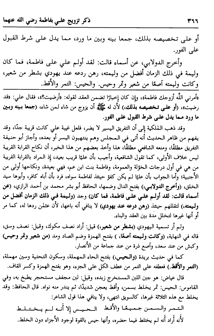 وقد ذهب المالكية إلى أن التفريق اليسير لا يضر، فلعل غيبة علي كانت قريبة جدا، وقد يفهم من ظاهر الحديث أنه أتى في المجلس وهم ينتهبون البسر أو بعده، وأجاز أبو حنيفة التفريق مطلقا، ومنعه الشافعي مطلقا، هذا وأخذ بعضهم من هذا الخبر، أن نكاح القرابة القريبة ليس خلاف الأولى، كما تقول الشافعية، وأجيب بأن عليا قريب بعيد؛ إذ المراد بالقرابة القريبة من هي في أول درجات الخؤلة والعمومة، وفاطمة بنت ابن عم، فهي بعيدة، ونكاحها أول من الأجنبية، وأما الجواب بأن عليا لم يكن كفئا حينئذ لفاطمة سواه، فرد بأن أباه كافر، وأبوها سيد الخلق، "وأخرج الدولابي" بفتح الدال وضمها، الحافظ أبو بشر محمد بن أحمد الرازي، "عن أسماء قالت: لقد أولم علي على فاطمة، فما كان" وجد "وليمة في ذلك الزمان أفضل من وليمته" لتقللهم حينئذ "رهن درعه عند يهودي" لا ينافي أنه باعها؛ لأن عثمان ردها له، كما مر أو أنها غيرها لتخلل مدة بين العقد والبناء.