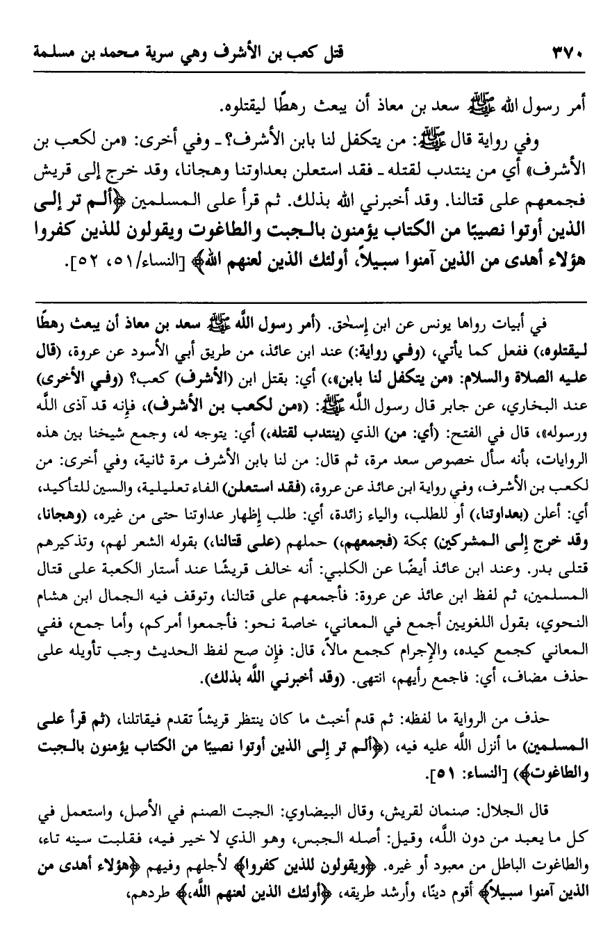 وفي رواية قال صلى الله عليه وسلم: "من يتكفل لنا بابن الأشرف"؟ وفي أخرى: "من لكعب بن الأشرف" أي من ينتدب لقتله، "فقد استعلن بعداوتنا وهجانا، وقد خرج إلى قريش فجمعهم على قتالنا، وقد أخبرني الله بذلك". ثم قرأ على المسلمين {أَلَمْ تَرَ إِلَى الَّذِينَ أُوتُوا نَصِيبًا مِنَ الْكِتَابِ يُؤْمِنُونَ بِالْجِبْتِ وَالطَّاغُوتِ وَيَقُولُونَ لِلَّذِينَ كَفَرُوا هَؤُلَاءِ أَهْدَى مِنَ الَّذِينَ آمَنُوا سَبِيلًا، أُولَئِكَ الَّذِينَ لَعَنَهُمُ اللَّهُ