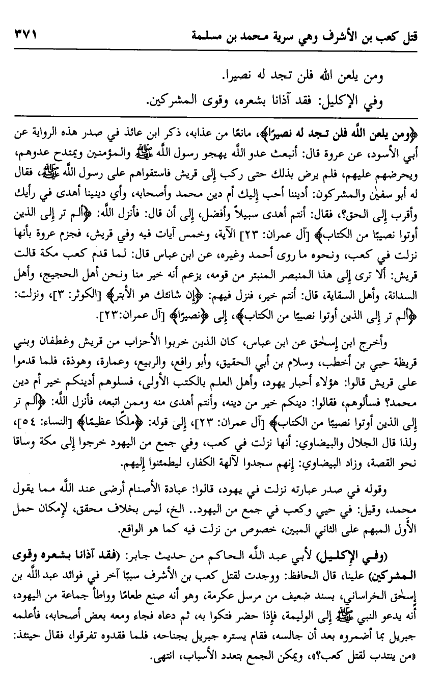 "وفي الإكليل" لأبي عبد الله الحاكم من حديث جابر: "فقد آذانا بشعره وقوى المشركين" علينا، قال الحافظ: ووجدت لقتل كعب بن الشرف سببا آخر في فوائد عبد الله بن إسحاق الخراساني، بسند ضعيف من مرسل عكرمة، وهو أنه صنع طعاما وواطأ جماعة من اليهود، أنه يدعو النبي صلى الله عليه وسلم إلى الوليمة، فإذا حضر فتكوا به، ثم دعاه فجاء ومعه بعض أصحابه، فأعلمه جبريل بما أضمروا بعد أن جالسه، فقام يستره جبريل بجناحه، فلما فقدوه تفرقوا، فقال حينئذ: "من ينتدب لقتل كعب؟ "، ويمكن الجمع بتعدد الأسباب، انتهى.