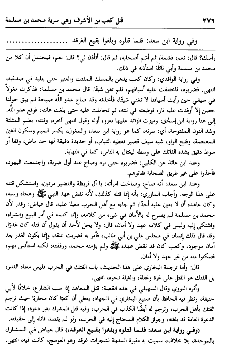 وعند ابن سعد: أنه صاح، وصاحت امرأته: يا آل قريظة والنضير مرتين، واستشكل قتله على هذا الوجه. وأجاب المازري: بأنه إنما قتله كذلك؛ لأنه نقض عهد النبي صلى الله عليه وسلم وهجه وسبه، وكان عاهده أن لا يعين عليه أحدا، ثم جاءه مع أهل الحرب معينا عليه، قال عياض: وقدر لأن محمد بن مسلمة لم يصرح له بالأمان في شيء من كلامه، وإنما كلمه في أمر البيع والشراء، واشتكى إليه وليس في كلامه عهد ولا أمان، قال: ولا يح لأحد أن يقول إن قتله كان غدرا. وقد قال ذلك إنسان في مجلس علي بن أبي طالب، فأمر به فضربت عنقه، وإنما يكون الغدر بعد أمان، موجود وكعب كان قد نقض عهده صلى الله عليه وسلم ولم يؤمنه محمد ورفقته، لكنه استأنس بهم، فتمكنوا منه من غير عهد ولا أمان.