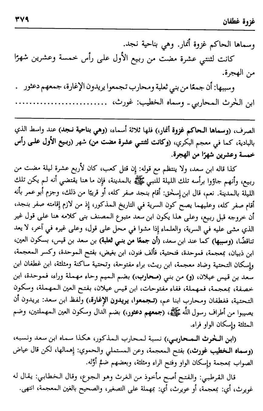 كذا قاله ابن سعد، ولا ينتظم مع قوله: إن قتل كعب، كان لأربع عشرة ليلة مضت من ربيع، وأنهم جاءوا برأسه تلك الليلة للنبي صلى الله عليه وسلم بالمدينة، فإن ما هنا يقتضي أنه لم يكن تلك الليلة بالمدينة. نعم قال ابن إسحاق: أقام بنجد صفر كله، أو قريبا من ذلك، وجزم أبو عمر بأنه أقام صفر كله، وعليهما يصح كون السرية في التاريخ المذكور؛ إذ من لازم إقامته صفر بنجد، أن خروجه قبل ربيع، وعلى هذا يكون ابن سعد متبوع المصنف بني كلامه هنا على قول غير الذي مشى عليه في السرية، والعلماء إذا مشوا في محل على قول، وعلى غيره في آخر، لا يعد تناقضا، "وسببها" كما عند ابن سعد، "أن جمعا من بني ثعلبة" بن سعد بن قيس، بسكون العين، ابن ذبيان، بمعجمة، فموحدة، فتحتية، فألف فنون، ابن بغيض، بفتح الموحدة، وكسر المعجمة، وإسكان التحتية وضاد معجمة، ابن ريث، براء مفتوحة، وتحتية ساكنة ومثلثة، ابن غطفان بن سعد بن قيس عيلان، "و" من بني "محارب" بضم الميم وحاء مهملة وراء، فموحدة، ابن خصفة، بمعجمة، فمهملة، ففاء مفتوحات، ابن قيس عيلان، بفتح العين المهملة، وسكون التحتية، فغطفان ومحارب ابنا عم، "تجمعوا، يريدون الإغارة" ولفظ ابن سعد: يريدون أن يصيبوا من أطراف رسول الله صلى الله عليه وسلم، "جمعهم دعثور،" بضم الدال وسكون العين المهملتين، وضم المثلثة وإسكان الواو فراء.