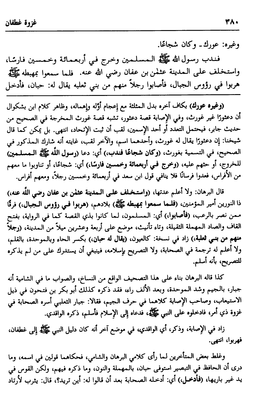 قال البرهان: ولا أعلم عدتها، "واستخلف على المدينة عثمان بن عفان رضي الله عنه" ذا النورين أمير المؤمنين، "فلما سمعوا بمهبطه صلى الله عليه وسلم" أي: المسلمون، لما كانوا بذي القصة كما في الرواية، بفتح القاف والصاد المهملة الثقيلة، وتاء تأنيث، موضع على أربعة وعشرين ميلا من المدينة، "رجلا منهم من بني ثعلبة" زاد في نسخة: كالعيون، "يقال له حبن" بكسر الحاء وبالموحدة، بالقلم، ولا أعلم له ترجمة في الصحابة، ولا التصريح بإسلامه، فينبغي أن يستدرك على من لم يذكره للتصريح، بأنه أسلم.