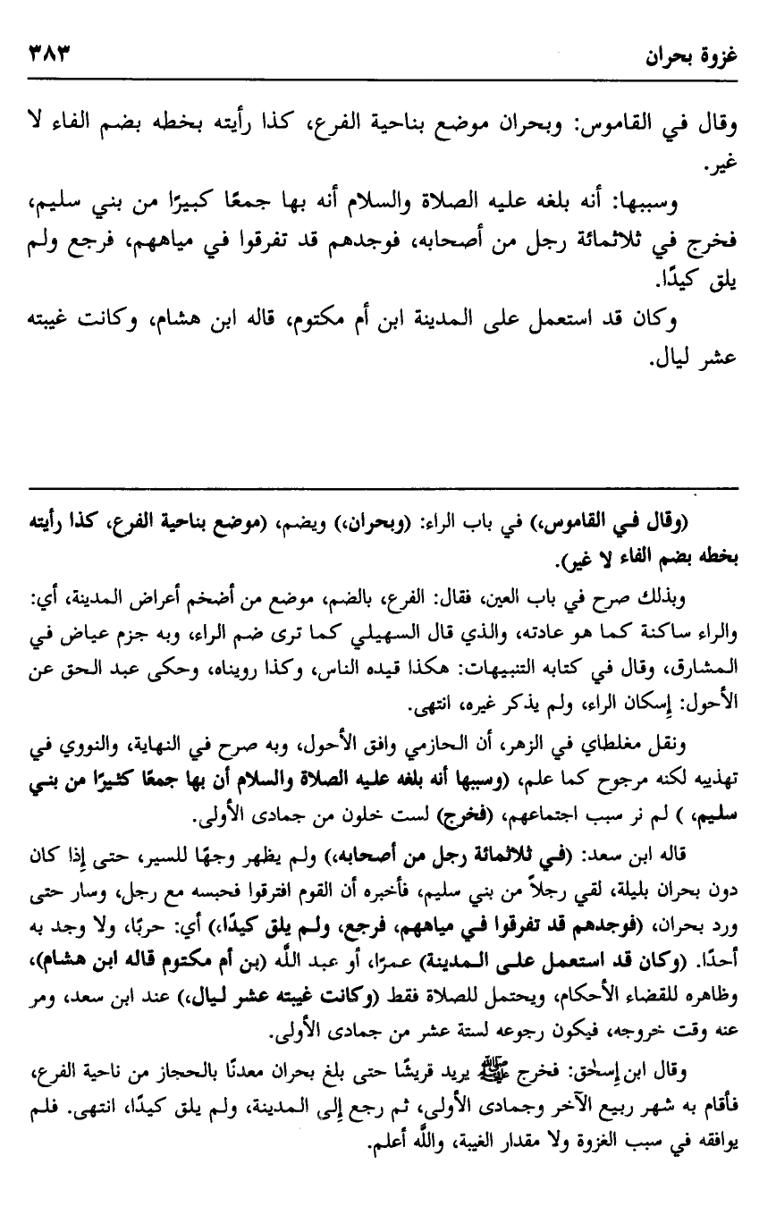 قاله ابن سعد: "في ثلاثمائة رجل من أصحابه" ولم يظهر وجها للسير، حتى إذا كان دون بحران بليلة، لقي رجلا من بني سليم، فأخبره أن القوم افترقوا فحبسه مع رجل، وسار حتى ورد بحران، "فوجدهم قد تفرقوا في مياههم، ولم يلق كيدا،" أي: حربا، ولا وجد به أحدا. "وكان قد استعمل على المدينة" عمرا، أو عبد الله "بن أم مكتوم قاله ابن هشام" وظاهره للقضاء الأحكام، ويحتمل للصلاة فقط "وكانت غيبته عشر ليال" عند ابن سعد، ومر عنه وقت خروجه، فيكون رجوعه لستة عشر من جمادى الأولى.