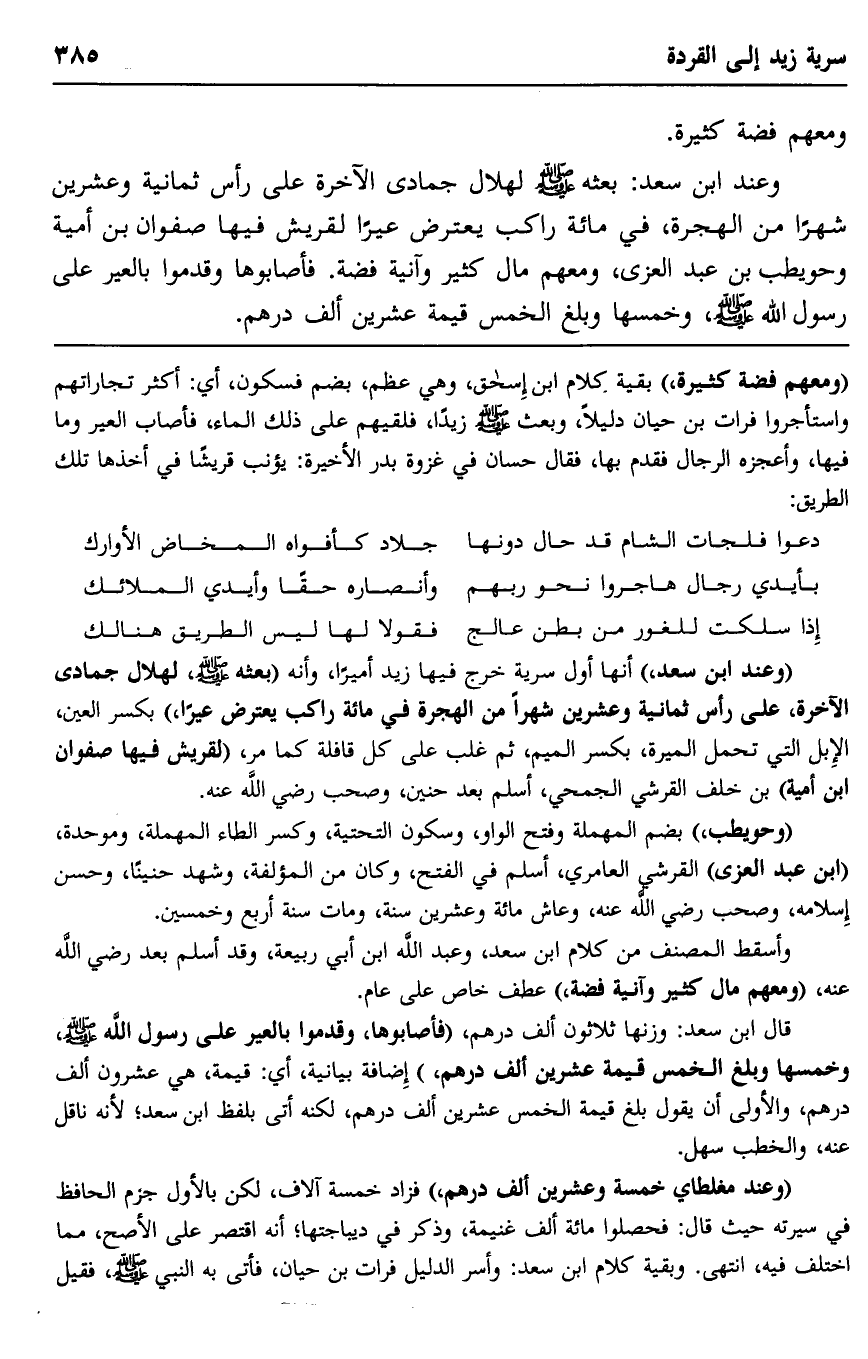 "ومعهم فضة كثيرة" بقية كلام ابن إسحاق، وهي عظم، بضم فسكون، أي: أكثر تجاراتهم واستأجروا فرات بن حيان دليلا، وبعث صلى الله عليه وسلم زيدا، فلقيهم على ذلك الماء، فأصاب العير وما فيها، وأعجزه الرجال فقدم بها، فقال حسان في غزوة بدر الأخيرة: يؤنب قريشا في أخذها تلك الطريق: