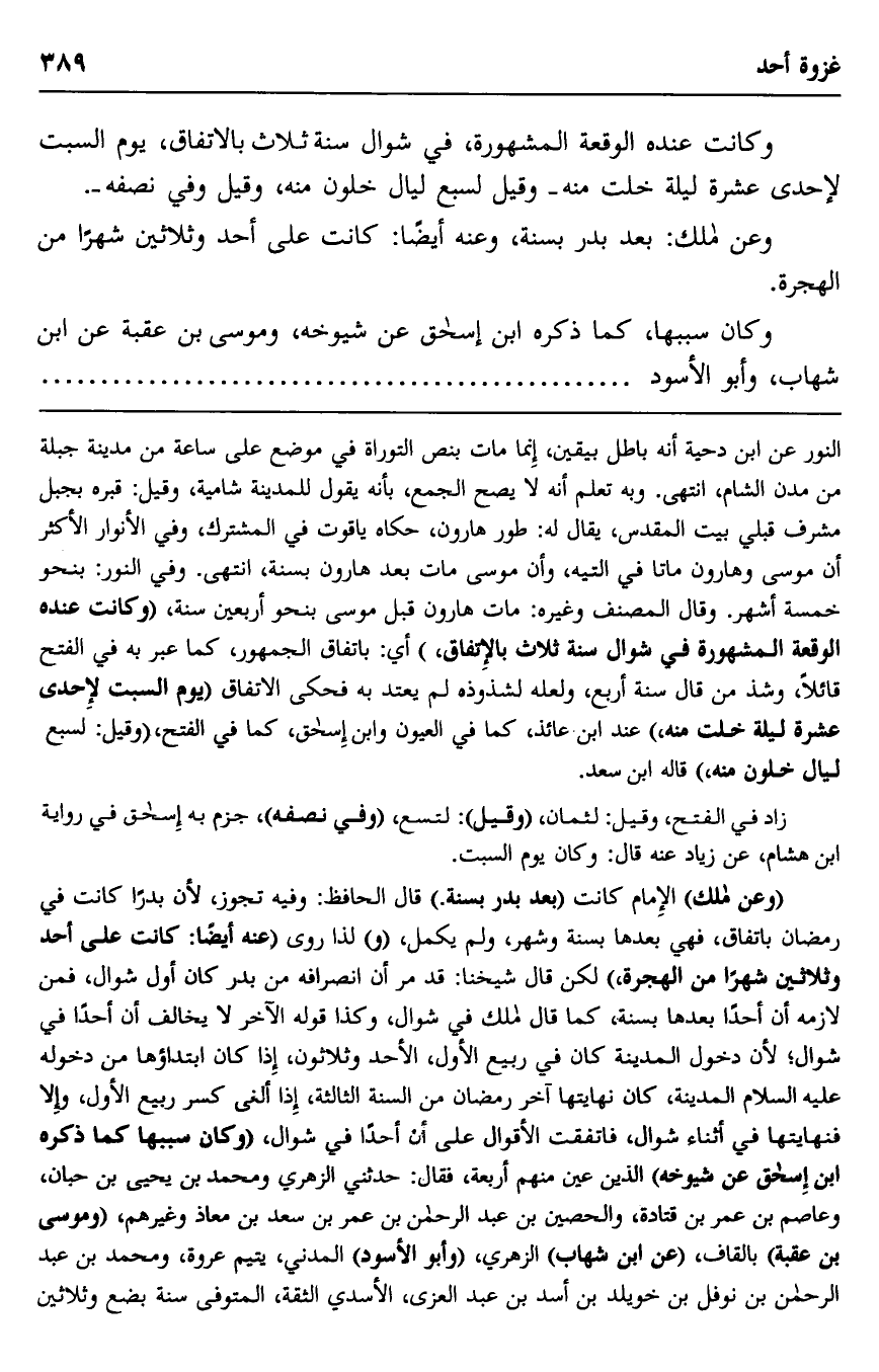 النور عن ابن دحية أنه باطل بيقين، إنما مات بنص التوراة في موضع على ساعة من مدينة جبلة من مدن الشام، انتهى. وبه تعلم أنه لا يصح الجمع، بأنه يقول للمدينة شامية، وقيل: قبره بجبل مشرف قبلي بين المقدس، يقال له: طور هارون، حكاه ياقوت في المشترك، وفي الأنوار الأكثر أن موسى وهارون ماتا في التيه، وأن موسى مات بعد هارون بسنة انتهى. وفي النور: بنحو خمسة أشهر. وقال المصنف وغيره: مات هارون قبل موسى بنحو أربعين سنة، "وكانت عنده الوقعة المشهورة في شوال سنة ثلاث بالاتفاق" أي: باتفاق الجمهور، كما عبر به في الفتح قائلا، وشذ من قال سنة أربع، ولعله لشذوذه لم يعتد به فحكى الاتفاق "يوم السبت لإحدى عشرة ليلة خلت منه،" عند ابن عائذ، كما في العيون وابن إسحاق، كما في الفتح، "وقيل: لسبع ليال خلون منه" قاله ابن سعد.