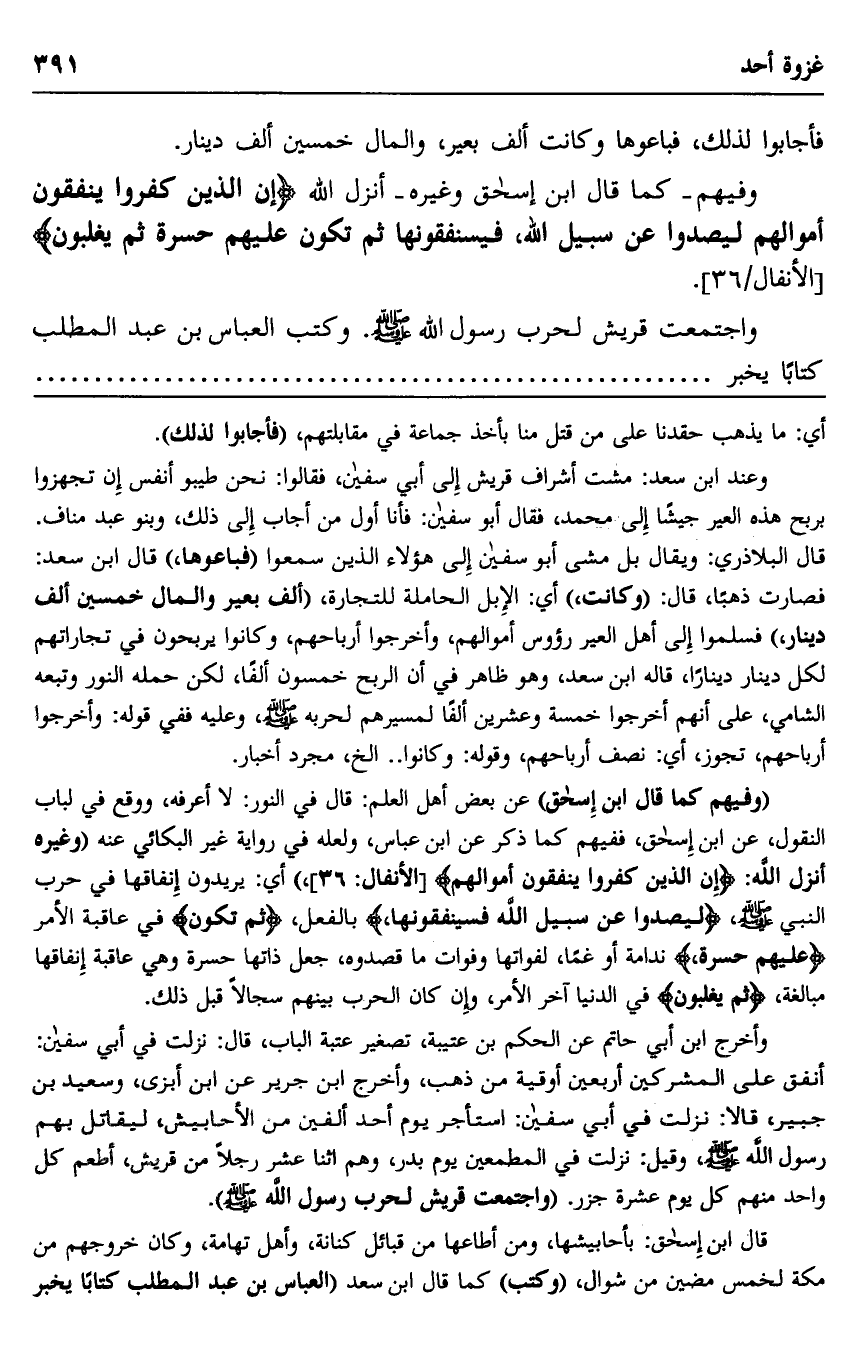 وفيهم -كما قال ابن إسحاق وغيره- أنزل الله: {إِنَّ الَّذِينَ كَفَرُوا يُنْفِقُونَ أَمْوَالَهُمْ لِيَصُدُّوا عَنْ سَبِيلِ اللَّهِ فَسَيُنْفِقُونَهَا ثُمَّ تَكُونُ عَلَيْهِمْ حَسْرَةً ثُمَّ يُغْلَبُونَ} [الأنفال: 36] .