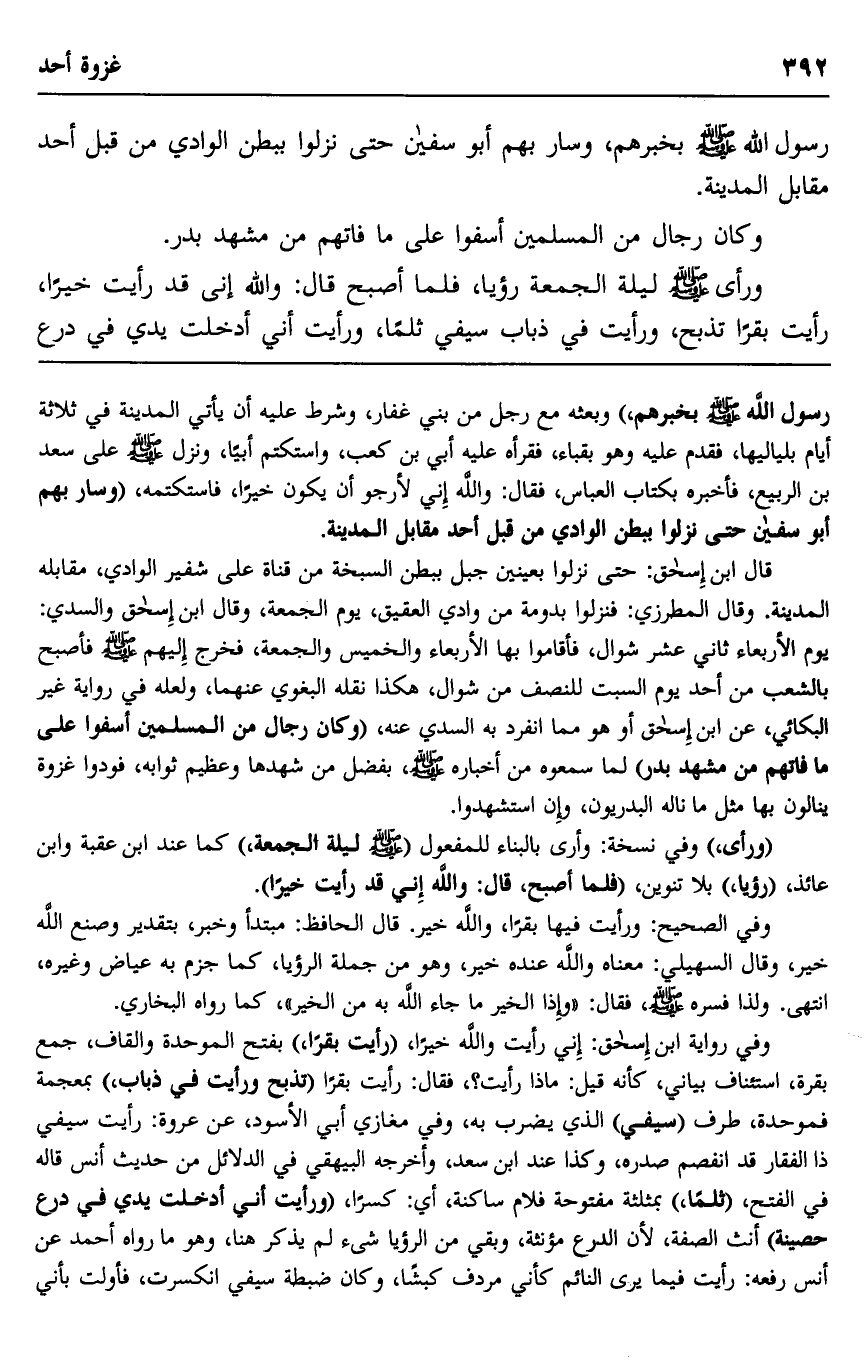 ورأى صلى الله عليه وسلم ليلة الجمعة رؤيا، فلما أصبح قال: "والله إني قد رأيت خيرا، رأيت بقرا تذبح، ورأيت في ذباب سيفي ثلما، ورأيت أني أدخلت يدي في درع