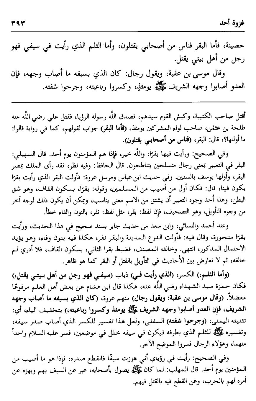 وعند أحمد والنسائي، وابن سعد من حديث جابر بسند صحيح في هذا الحديث، "ورأيت بقرا منحورة"، وقال فيه: فأولت الدرع المدينة والبقر نفر، هكذا فيه بنون وفاء، وهو يؤيد الاحتمال المذكور، انتهى. وخالفه المصنف، فضبط بقرا الثاني، بسكون القاف، فلا أدري لم خالفه، ثم لا تعارض بين الأحاديث في التأويل بالقتل أو البقر كما هو ظاهر.