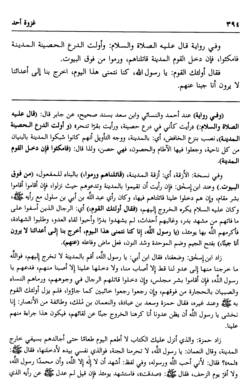 زاد ابن إسحاق: وضعفنا، فقال ابن أبي: يا رسول الله، أقم بالمدينة لا تخرج إليهم، فوالله ما خرجنا منها إلى عدو لنا قط إل أصاب منا، ولا دخلها علينا إلا أصبنا منهم، فدعهم يا رسول الله، فإن أقاموا بشر مجلس، وإن دخلوا قاتلهم الرجال في وجوههم، ورماهم النساء والصبيان بالحجارة من فوقهم، وإن رجعوا رجعواخائبين كما جاءوا، فلم يزل أولئك القوم به صلى الله عليه وسلم وعند غيره، فقال حمزة وسعد بن عبادة، والنعمان بن مالك، وطائفة من الأنصار: إنا نخشى يا رسول الله أن يظن عدونا أن كرهنا الخروج جبنا عن لقائهم، فيكون هذا جراءة منهم علينا.