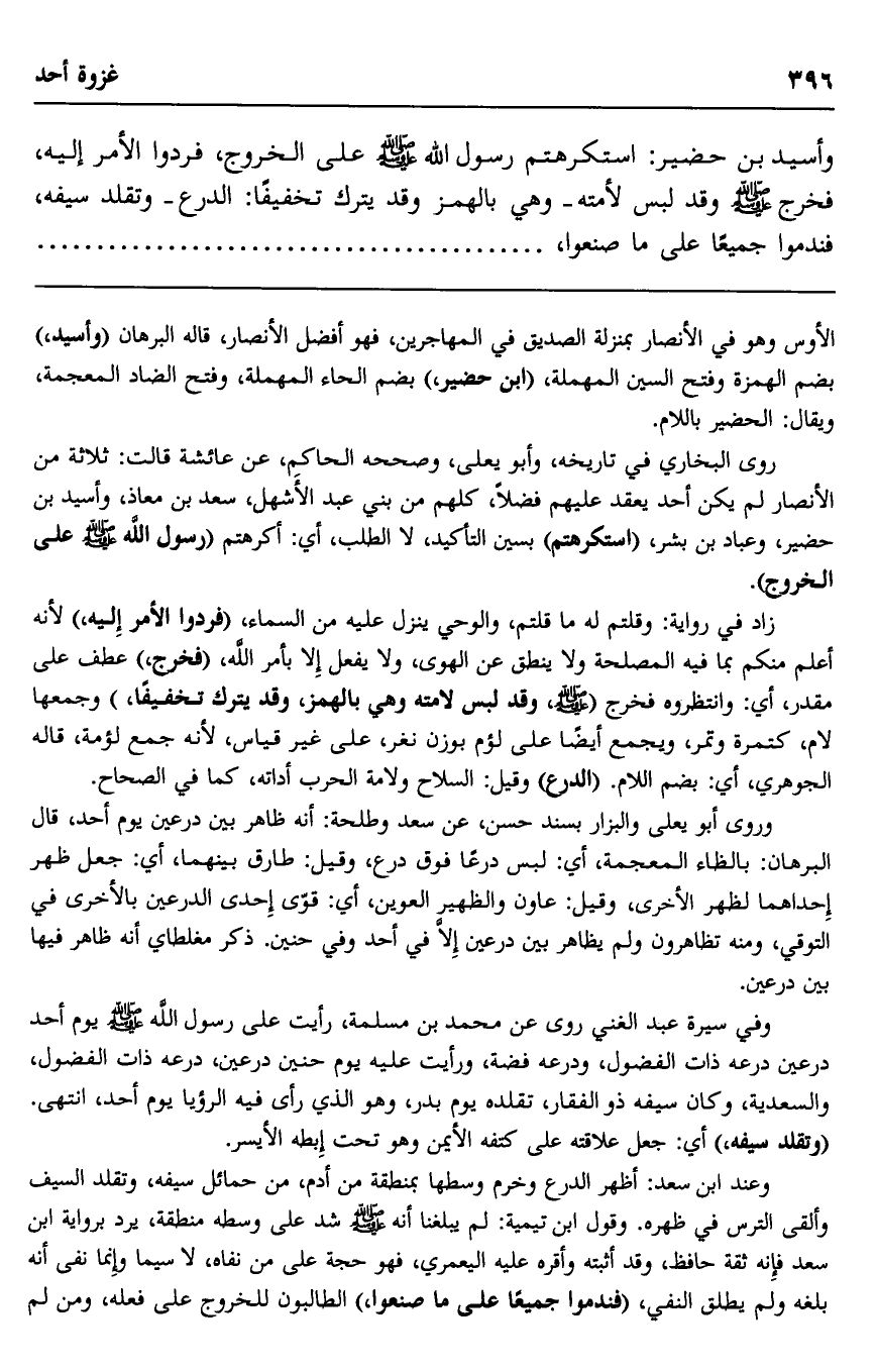 وأسيد بن حضير: استكرهتم رسول الله صلى الله عليه وسلم على الخروج، فردوا الأمر عليه، فخرج صلى الله عليه وسلم وقد لبس لأمته -وهي بالهمز وقد يترك تخفيفا: الدرع- وتقلد سيفه، فندموا جميعا على ما صنعوا،