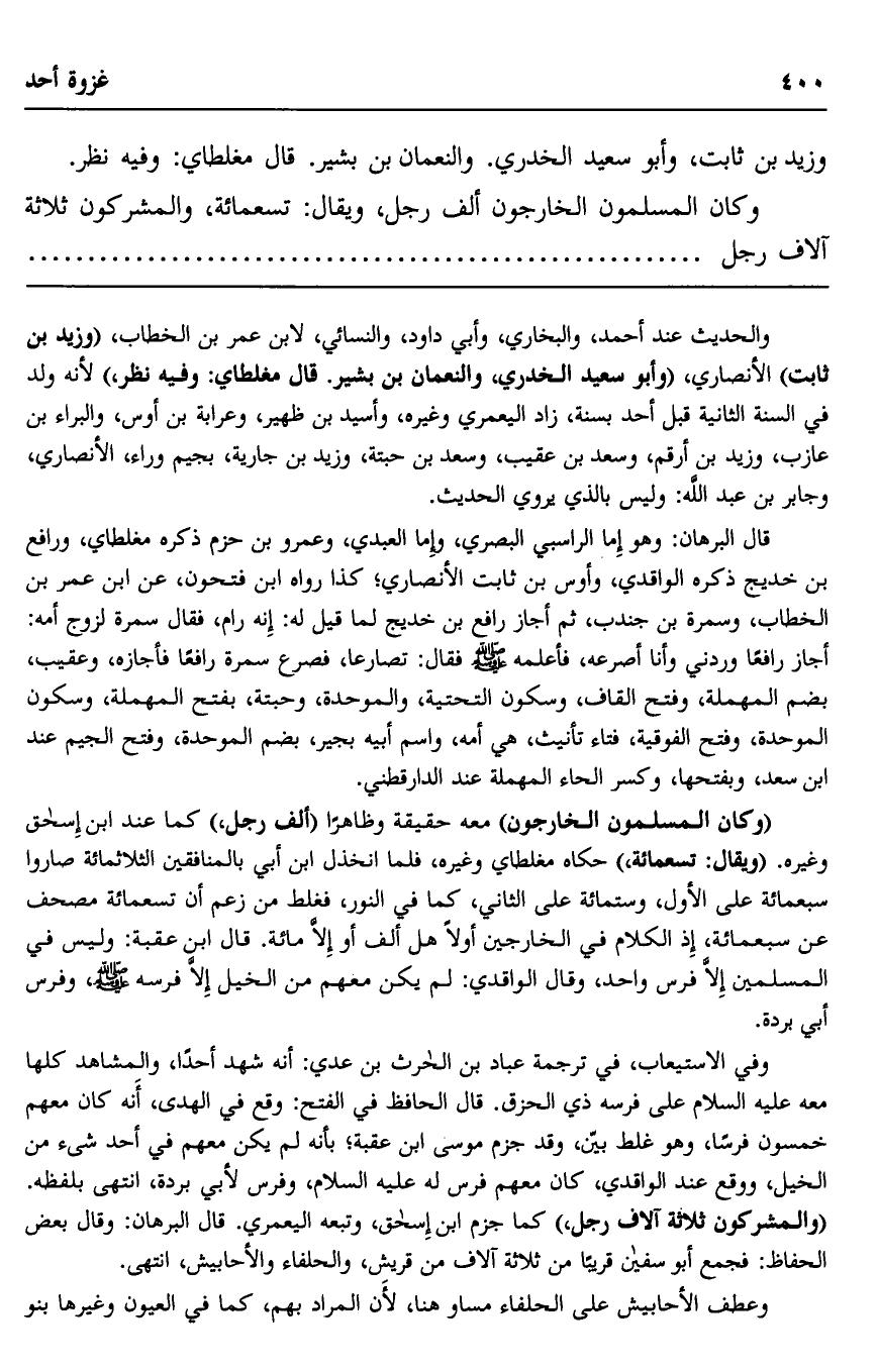 "وكان المسلمون الخارجون" معه حقيقة وظاهرا "ألف رجل"، كما عند ابن إسحاق وغيره. "ويقال: تسعمائة" حكاه مغلطاي وغيره، فلما انخذل ابن أبي بالمنافقين الثلاثمائة صاروا سبعمائة على الأول، وستمائة على الثاني، كما في النور، فغلط من زعم أن تسعمائة مصحف عن سبعمائة؛ إذ الكلام في الخارجين أولا هل ألف أو إلا مائة. قال ابن عقبة: وليس في المسلمين إلا فرس واحد، وقال الواقدي: لم يكن معهم من الخيل إلا فرسه صلى الله عليه وسلم، وفرس بي بردة.