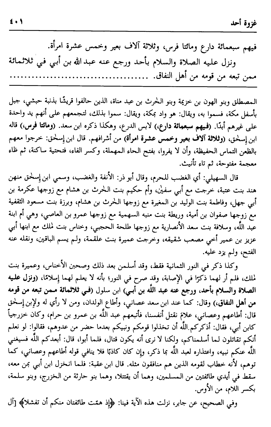 وكذا ذكر في النور الثمانية فقط، وقد أسلمن بعد ذلك وصحبن الأخناس، وعميرة بنت مالك، فلم أر لما ذكرا في الإصابة، وقد صرح في النور، بأنه لا يعلم لهما إسلاما، "ونزل عليه الصلاة والسلام بأحد، ورجع عنه عبد الله بن أبي" بن سلول "في ثلاثمائة ممن تبعه من قومه من أهل النفاق" وقال: كما عند ابن سعد عصاني، وأطاع الوالدان ومن لا رأي له ولإبن إسحق قال: أطاعهم وعصاني، علام نقتل أنفسنا، فأتبعهم عبد الله بن عمرو بن حرام، وكان خزرجيا كابن أبي، فقال: أذكركم الله أن تخذلوا قومكم ونبيكم بعدما حضر من عدوهم، فقالوا: لو نعلم أنكم تقاتلون لما أسلمناكم، ولكنا لا نرى أنه يكون قتال، فلما أبوا، قال: أبعدكم الله فسيغني الله عنكم نبيه، واعتذاره لعبد الله، بما ذكر، وإن كان كاذبا فلا ينافي قوله أطاعهم وعصاني، كما توهم؛ لأنه خطاب لقومه الذين هم منافقون مثله. قال ابن عقبة: فلما انخزل ابن أبي بمن معه، سقط في أيدي طائفتين من المسلمين، وهما أن يقتتلا، وهما بنو حارثة من الخزرج، وبنو سلمة، بكسر اللام، من الأوس.