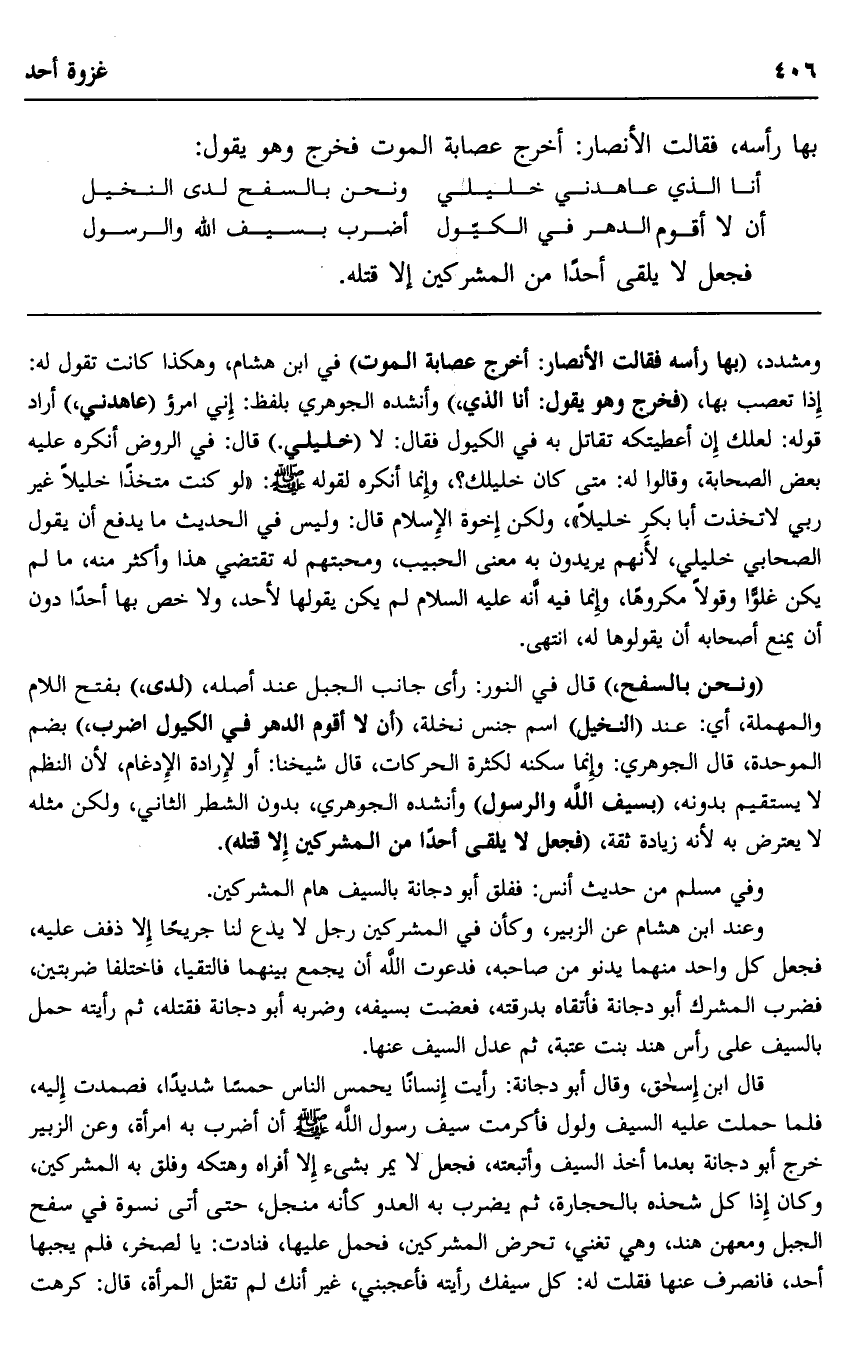 "ونحن بالسفح،" قال في النور: رأى جانب الجبل عند أصله، "لدى" بفتح اللام والمهملة، أي: عند "النخيل" اسم جنس نخلة، "أن لا أقوم الدهر في الكيول اضرب" بضم الموحدة، قال الجوهري: وإنما سكنه لكثرة الحركات، قال شيخنا: أو لإرادة الإدغام؛ لأن النظم لا يستقيم بدونه، "بسيف الله والرسول" وأنشده الجوهري، بدون الشطر الثاني، ولكن مثله لا يعترض به لأنه زيادة ثقة، "فجعل لا يلقى أحدا من المشركين إلا قتله".