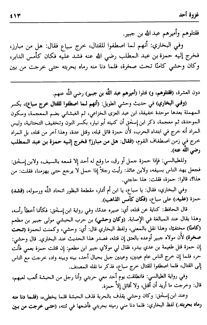 وفي البخاري، فقال: يا سباع، يابن أم أنمار، مقطعة البظور اتحاد الله ورسوله، "فشد" حمزة "عليه" على سباع، "فكان كأمس الذاهب".