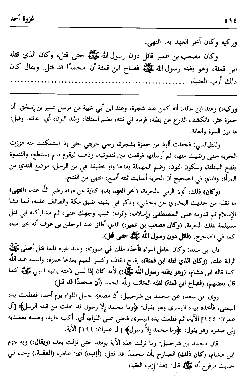 وكان مصعب بن عمير قاتل دون رسول الله صلى الله عليه وسلم حتى قتل، وكان الذي قتله ابن قمئة، وهو يظنه رسول الله صلى الله عليه وسلم فصاح ابن قمئة أن محمدًا قد قتل. ويقال كان ذلك أزب العقبة،