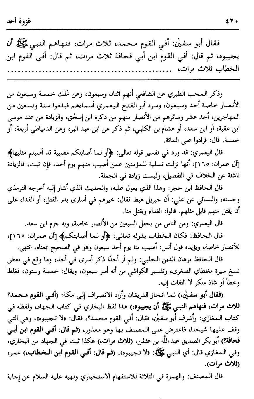 فقال أبو سفيان: أفي القوم محمد، ثلاث مرات، فنهاهم النبي صلى الله عليه وسلم أن يجيبوه، ثم قال: أفي القوم ابن أبي قحافة ثلاث مرات، ثم قال: أفي القوم ابن الخطاب ثلاث مرات،