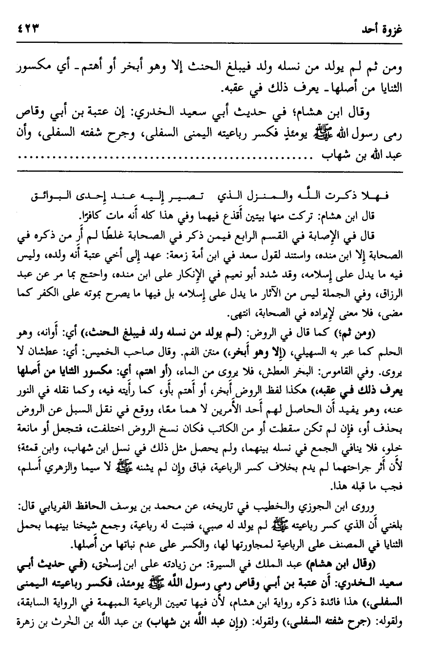 وقال ابن هشام: في حديث أبي سعيد الخدري: إن عتبة بن أبي وقاص رمى رسول الله صلى الله عليه وسلم يومئذ فكسر رباعيته اليمنى السفلى، وجرح شفته السفلى، وأن عبد الله بن شهاب