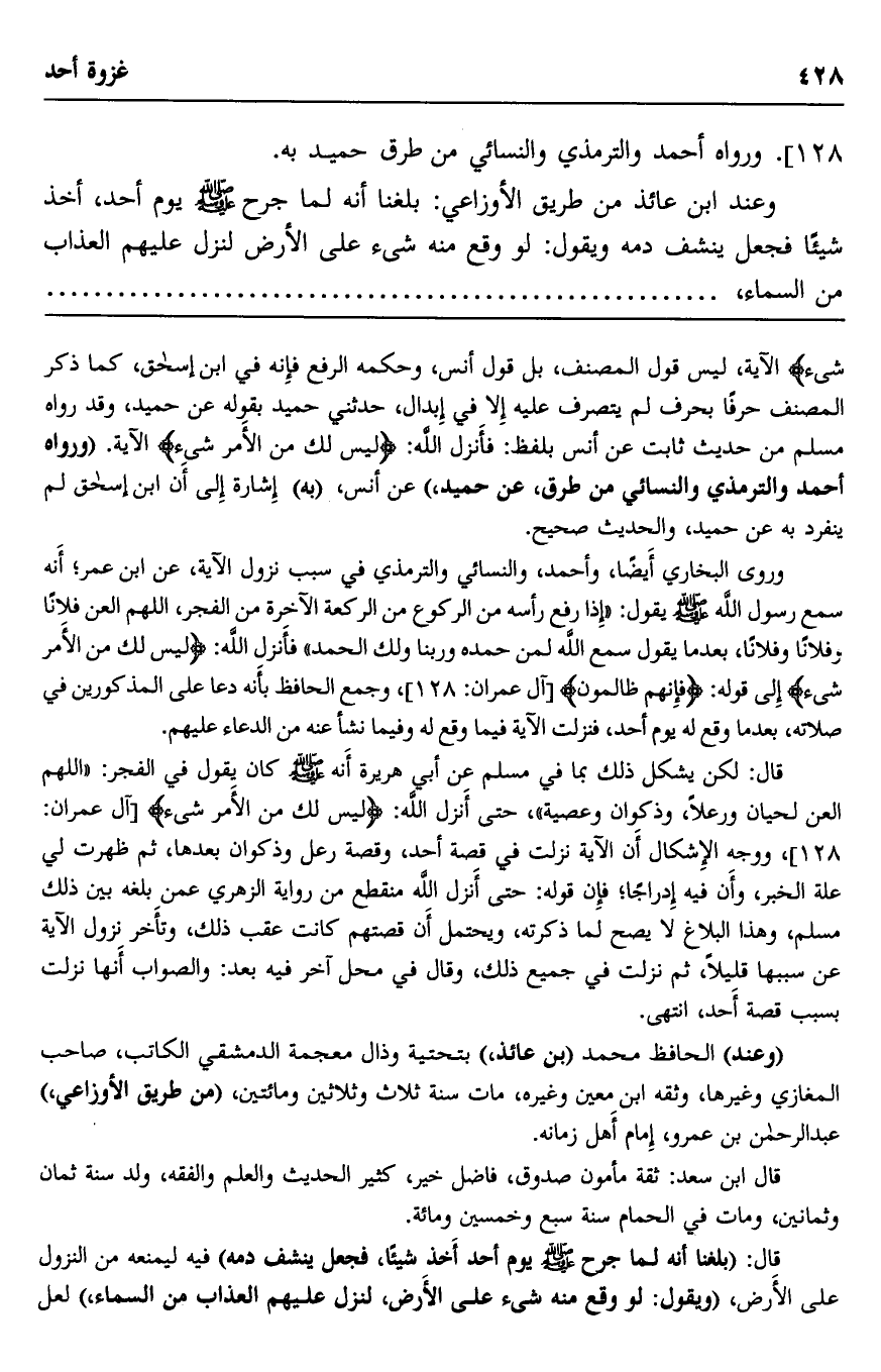 شَيْءٌ} الآية. ليس قول المصنف، بل قول أنس، وحكمه الرفع, فإنه في ابن إسحاق، كما ذكر المصنف حرفًا بحرف لم يتصرَّف عليه إلّا في إبدال، حدَّثني حميد بقوله عن حميد، وقد رواه مسلم من حديث ثابت عن أنس بلفظ: فأنزل الله: {لَيْسَ لَكَ مِنَ الْأَمْرِ شَيْءٌ} الآية. "ورواه أحمد والترمذي والنسائي من طرق، عن حميد" عن أنس، "به" إشارة إلى ابن إسحاق, لم ينفرد به عن حميد، والحديث صحيح.