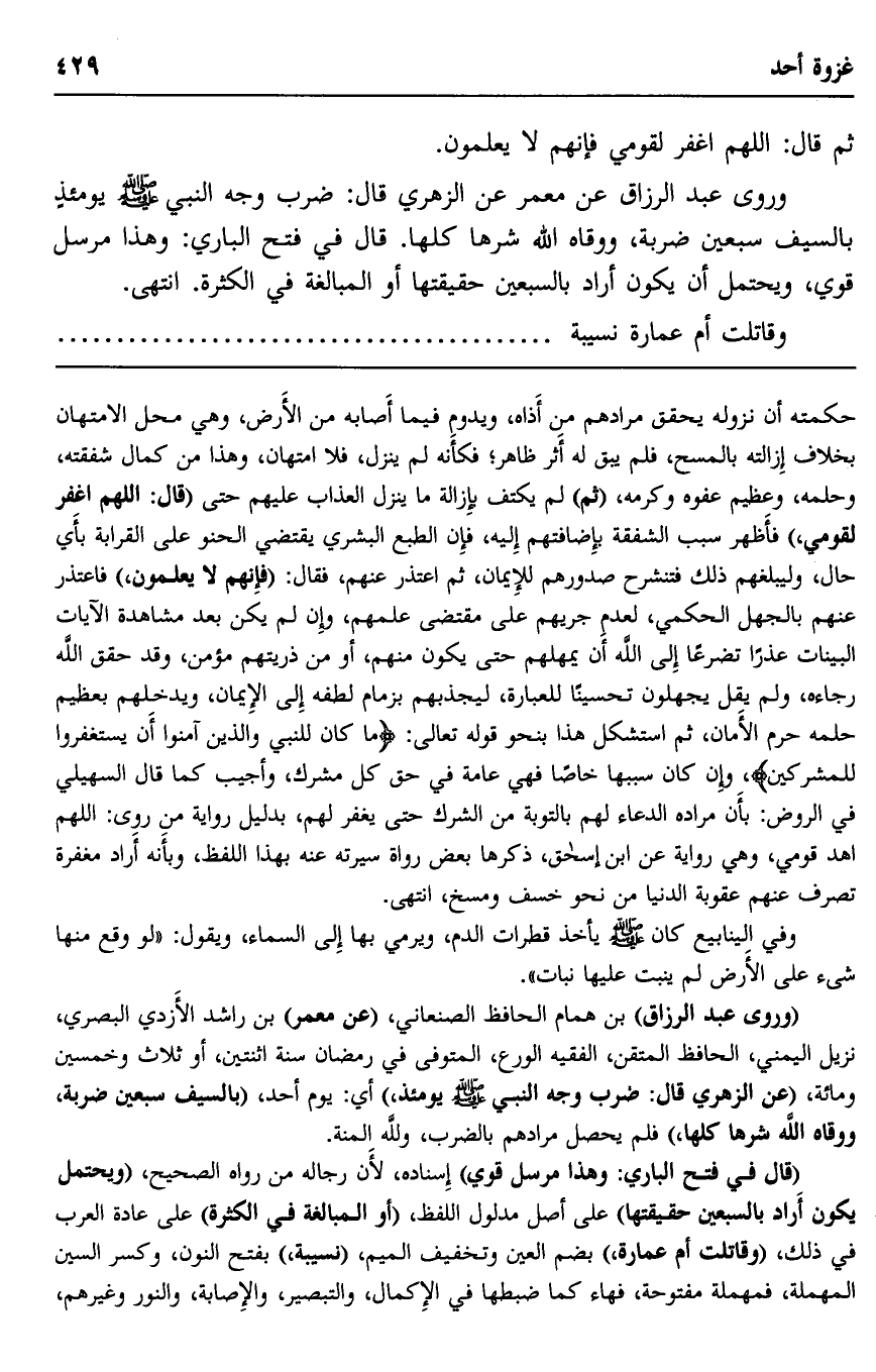 وروى عبد الرزاق عن معمر عن الزهري قال: ضُرِبَ وجه النبي -صلى الله عليه وسلم- يومئذ بالسيف سبعين ضربة، ووقاه الله شرها كلها. قال في فتح الباري: وهذا مرسل قوي، ويحتمل أن يكون أراد بالسبعين حقيقتها, أو المبالغة في الكثرة. انتهى.
