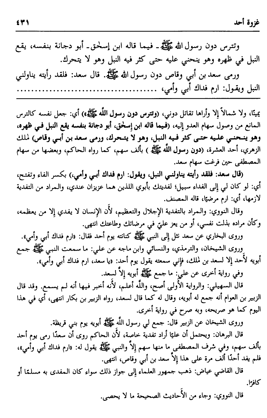 ورمى سعد بن أبي وقاص دون رسول الله -صلى الله عليه وسلم. قال سعد: فلقد رأيته يناولني النبل ويقول: "ارم فداك أبي وأمي،