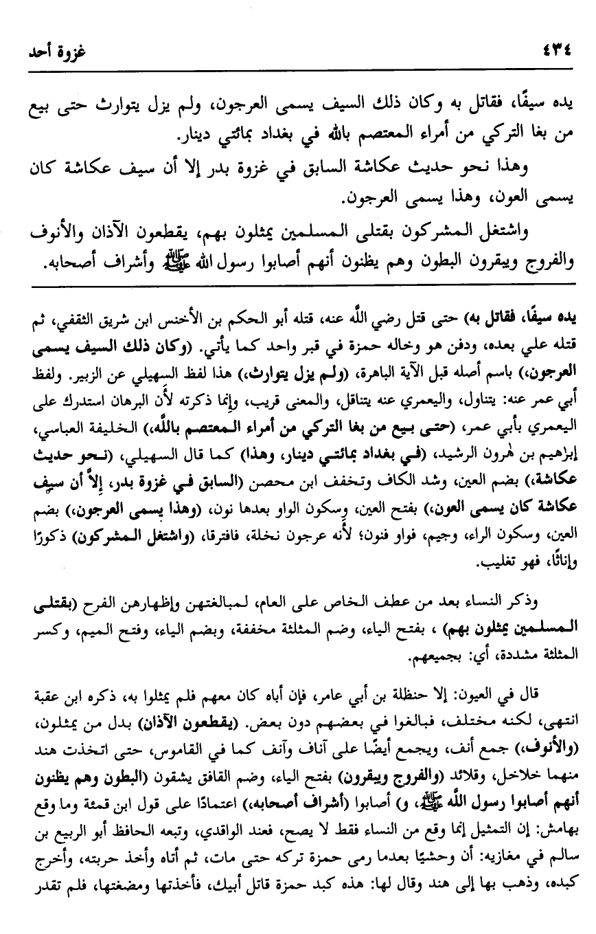يده سيفًا، فقاتل به" حتى قُتِلَ -رضي الله عنه، قتله أبو الحكم بن الأخنس بن شريق الثقفي، ثم قتله علي بعده، ودُفِنَ هو وخاله حمزة في قبرٍ واحد كما يأتي. "وكان ذلك السيف يسمَّى العرجون" باسم أصله قبل الآية الباهرة، "ولم يزل يتوارث" هذا لفظ السهيلي عن الزبير. ولفظ أبي عمر عنه: يتناول، واليعمري عنه: يتناقل، والمعنى قريب، وإنما ذكرته لأنَّ البرهان استدرك على اليعمري بأبي عمر، "حتى بيع من بغا التركي من أمراء المعتصم بالله" الخليفة العباسي، إبراهيم بن هارون الرشيد، "في بغداد بمائتي دينار"، وهذا" كما قال السهيلي، "نحو حديث عكاشة -بضم العين وشد الكاف وتخفف- ابن مصحن "السابق في غزوة بدر، إلّا أن سيف عكاشة كان يسمَّى العون -بفتح العين، وسكون الواو بعدها نون, وهذا يسمَّى العرجون" -بضم العين وسكون الراء، وجيم، فواو فنون؛ لأنه عرجون نخلة، فافترقا، "واشتغل المشركون" ذكورًا وإناثًا، فهو تغليب.