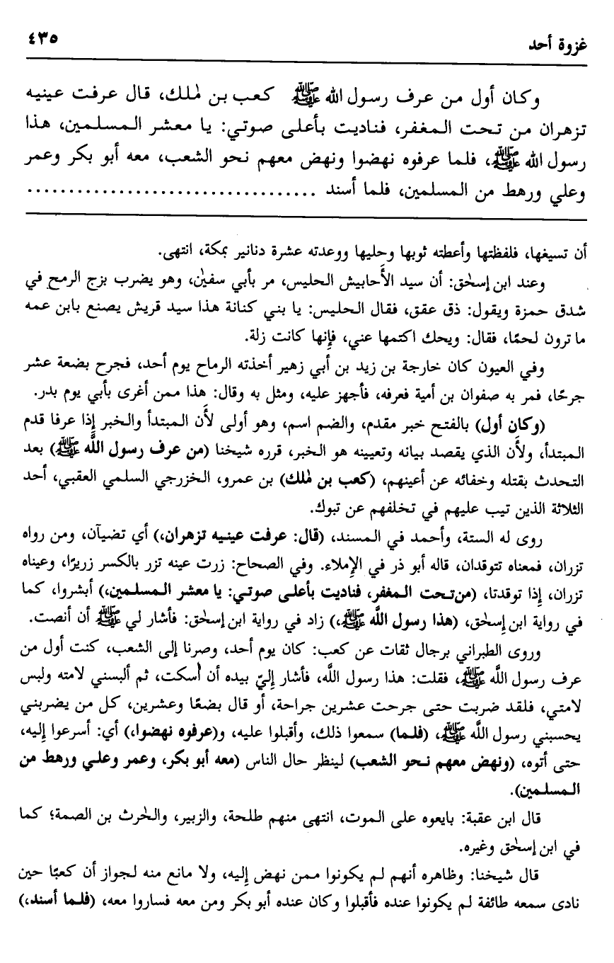 وروى الطبراني برجال ثقات عن كعب: كان يوم أحد، وصرنا إلى الشِّعب، كنت أول من عرف رسول الله -صلى الله عليه وسلم, فقلت: هذا رسول الله، فأشار إلي بيده أن اسكت، ثم ألبسني لامته ولبس لامتي، فلقد ضربت حتَّى جرحت عشرين جراحة، أو قال: بضعًا وعشرين، كل من يضربني يحسبني رسول الله -صلى الله عليه وسلم, "فلمَّا" سمعوا ذلك، وأقبلوا عليه، و"عرفوه نهضوا" أي: أسرعوا إليه، حتى أتوه، "ونهض معهم نحو الشِّعْب"؛ لينظر حال الناس, "معه أبو بكر، وعمر وعلي ورهط من المسلمين".