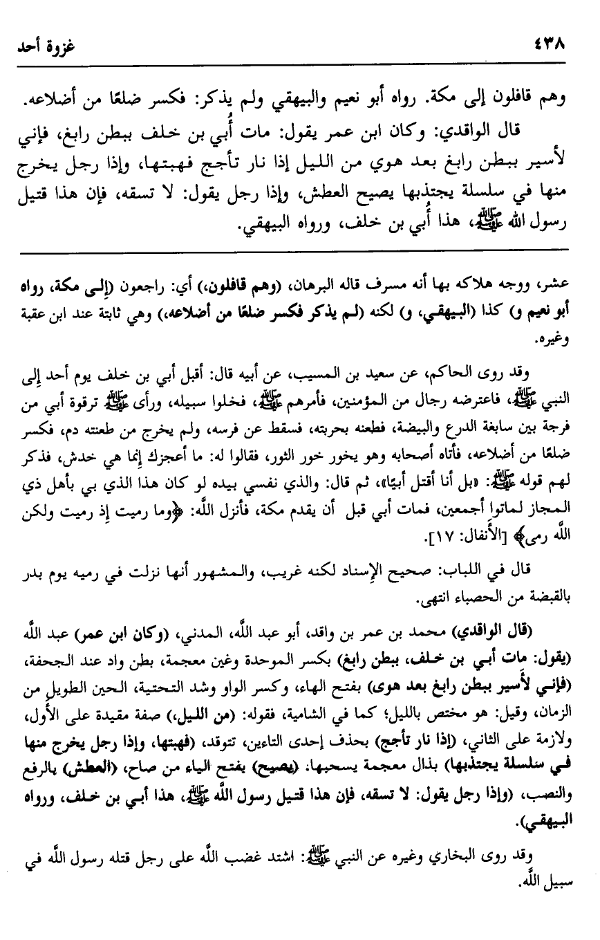 وقد روى الحاكم، عن سعيد بن المسيب عن أبيه قال: أقبل أُبَيّ بن خلف يوم أحد إلى النبي -صلى الله عليه وسلم, فاعترضه رجال من المؤمنين، فأمرهم -صلى الله عليه وسلم, فخلوا سبيله, ورأى -صلى الله عليه وسلم- ترقوة أُبَيّ من فرجة بين سابغة الدرع والبيضة، فطعنه بحربته، فسقط عن فرسه، ولم يخرج من طعنته دم، فكسر ضلعًا من أضلاعه، فأتاه أصحابه وهو يخور خور الثور، فقالوا له: ما أعجزك إنما هي خدش، فذكر لهم قوله -صلى الله عليه وسلم: "بل أنا أقتل أبيًّا"، ثم قال: "والذي نفسي بيده لو كان هذا الذي بي بأهل ذي المجاز لماتوا أجمعين، فمات أُبَيّ قبل أن يقدم مكة، فأنزل الله: {وَمَا رَمَيْتَ إِذْ رَمَيْتَ وَلَكِنَّ اللَّهَ رَمَى} [الأنفال: 17] .