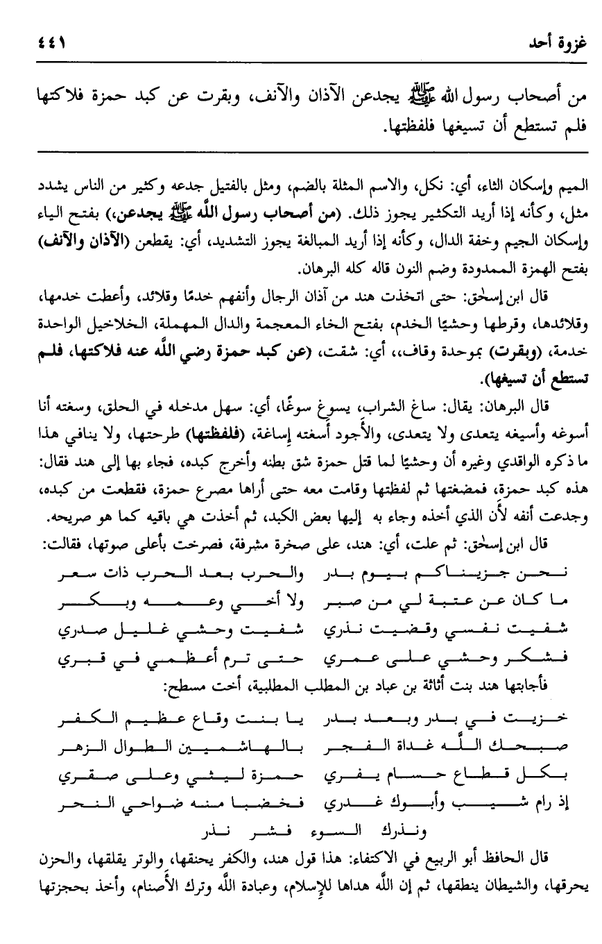 قال الحافظ أبو الربيع في الاكتفاء: هذا قول هند، والكفر يحنقها، والوتر يقلقها، والحزن يحرقها، والشيطان ينطقها، ثم إن الله هداها للإسلام وعبادة الله وترك الأصنام، وأخذ بحجزتها