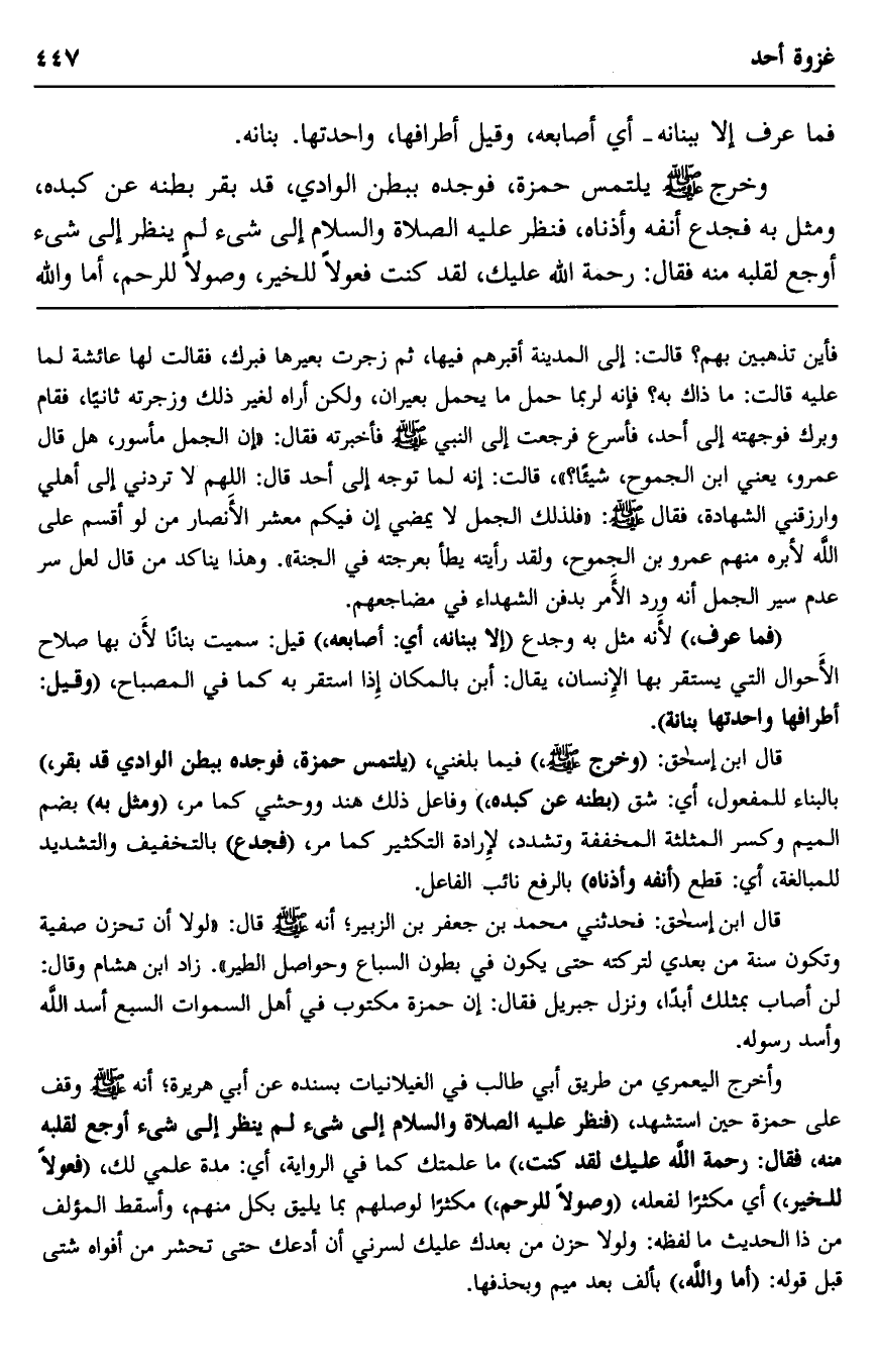 قال ابن إسحاق: "وخرج -صلى الله عليه وسلم" فيما بلغني، "يلتمس حزة، فوجده ببطن الوادي قد بقر" بالبناء للمفعول، أي: شُقَّ "بطنه عن كبده", وفاعل ذلك هند ووحشي كما مَرَّ، "ومثل به" بضم الميم وكسر المثلثة المخففة, وتشدد لإرادة التكثير كما مَرَّ، "فجدع" بالتخفيف والتشديد للمبالغة، أي: قطع "أنفه وأذناه" بالرفع نائب الفاعل.