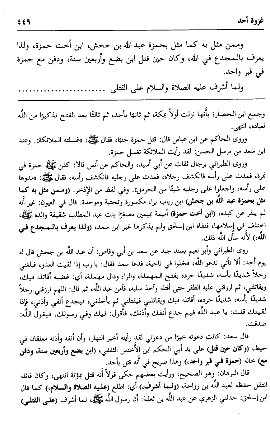 وروى الطبراني برجال ثقات عن أبي أسيد، والحاكم عن أنس قالا: كفَّن -صلى الله عليه وسلم- حمزة في نمرة، فمدت على رأسه فانكشف رجلاه, فمدت على رجليه فانكشف رأسه، فقال -صلى الله عليه وسلم: "مدوها على رأسه، واجعلوا على رجليه شيئًا من الحرمل" , وفي لفظ: من الإذخر. "وممن مثِّل به كما مثِّل بحمزة عبد الله بن جحش" ابن رياب براء مكسورة وتحتية وموحدة. قال في العيون: غير أنه لم يبقر عن كبده، "ابن أخت حمزة" أميمة -بميمين مصغرًا- بنت عبد المطلب, شقيقة والده -صلى الله عليه وسلم، اختُلِف في إسلامها، فنفاه ابن إسحاق, ولم يذكرها غير ابن سعد، "ولذا يعرف بالمجدع في الله"؛ لأنه سأل الله ذلك.