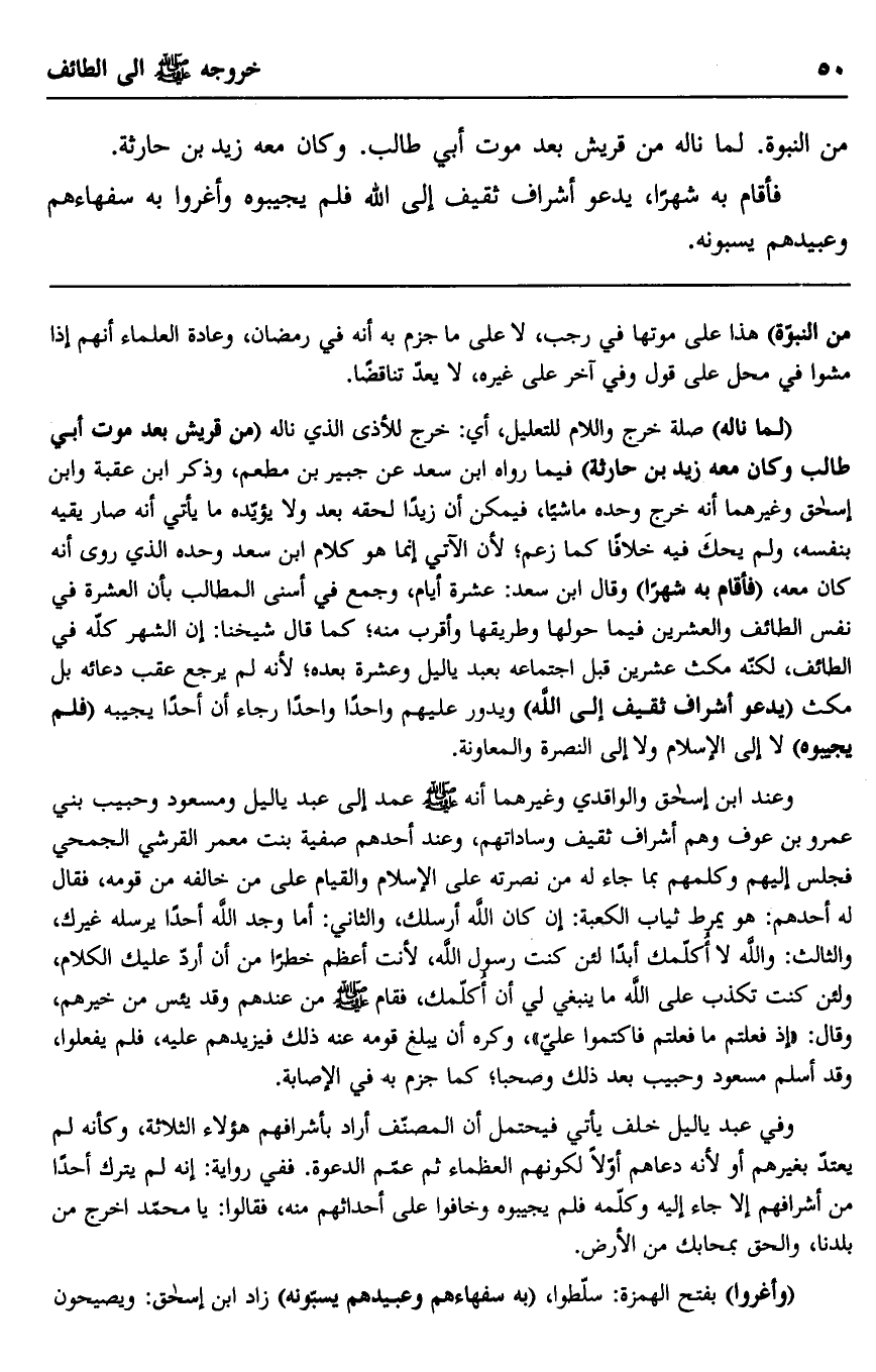 وعند ابن إسحاق والواقدي وغيرهما أنه صلى الله عليه وسلم عمد إلى عبد ياليل ومسعود وحبيب بني عمرو بن عوف وهم أشراف ثقيف وساداتهم، وعند أحدهم صفية بنيت معمر القرشي الجمحي فجلس إليهم وكلمهم بما جاء له من نصرته على الإسلام والقيام على من خالفه من قومه، فقال له أحدهم: هو يمرط ثياب الكعبة: إن كان الله أرسلك، والثاني: أما وجد الله أحدا يرسله غيرك، والثالث: والله لا أكلمك أبدا لئن كنت رسول الله، لأنت أعظم خطرا من أن أرد عليك الكلام، ولئن كنت تكذب على الله ما ينبغي لي أن أكلمك، فقال صلى الله عليه وسلم من عندهم وقد يئس من خيرهم، وقال: "إذ فعلتم ما فعلتم فاكتموا علي"، وكره أن يبلغ قومه عنه ذلك فيزيدهم عليه، فلم يفعلوا، وقد أسلم مسعود وحببيب بعد ذلك وصحبا؛ كما جزم به في الإصابة.