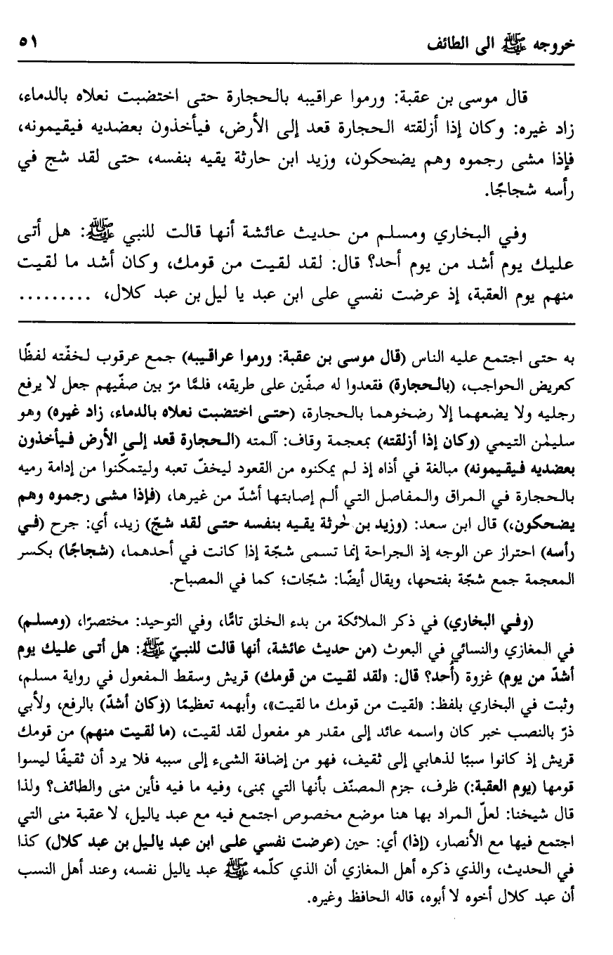 قال موسى بن عقبة: ورموا عراقبيه بالحجارة حتى اختضبت نعلاه بالدماء، زاد غيره: وكان إذا أزلقته الحجارة قعد إلى الأرض؛ فيأخذون بعضديه فيقيمونه، فإذا مشى رجموه وهم يضحكون، وزيد بن حارثة يقيه بنفسه، حتى لقد شج في رأسه شجاجا.