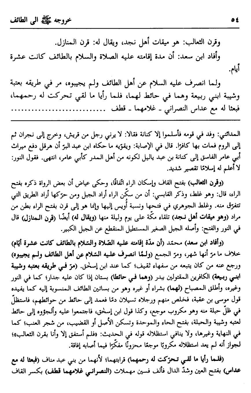 "وأفاد ابن سعد" محمد "أن مدة إقامته عليه الصلاة والسلام بالطائف كانت عشرة أيام" خلاف ما مر أنها شهر، ومر الجمع "ولما انصرف عليه السلام عن أهل الطائف ولم يجيبوه" ورجع عنه من كان يتبعه من سفهاء ثقيف؛ كما عند ابن إسحاق. "مر في طريقه بعتبه وشيبة ابني ربيعة" الكافرين المقتولين ببدر "وهما في حائطا" بستان إذا كان عليه عليه جدار؛ كما في النور وغيره، وأطلق المصباح "لهما" بشراء أو غيره وهو من بساتين الطائف المنسوبة إليه كما يفيده قول موسى بن عقبة، فخلص منهم ورجلاه تسيلان دما فعمد إلى حائط من حوائطهم، فاستظل في ظل حبلة منه وهو مكروب موجع، وكذا قول ابن إسحاق فاجتمعوا عليه وألجئوه إلى حائط لعتبة وسيبة والحيلة، بفتح الحاء والموحدة وتسكن الأصل أو القضيب، من شجر العنب؛ كما في النهاية وغيرها، ولا ينافي استظلاله قوله في الحديث: "فلم أستفق إلا وأنا بقرن الثعالب"؛ لجواز أنه لم يعد استظلاله مكروبا موجعا محزونا مفكرا فيما أصابه إفاقة.