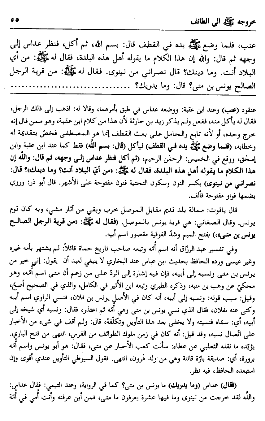 عنب، فلما وضع -صلى الله عليه وسلم- يده في القطف قال: "بسم الله، ثم أكل"، فنظر عداس إلى وجهه ثم قال: والله إن هذا الكلام ما يقوله أهل هذه البلدة، فقال له -صلى الله عليه وسلم: "من أي البلاد أنت. وما دينك"؟ قال نصراني من نينوى. فقال له -صلى الله عليه وسلم: "من قرية الرجل الصالح يونس بن متى"؟ قال: وما يدريك؟..............