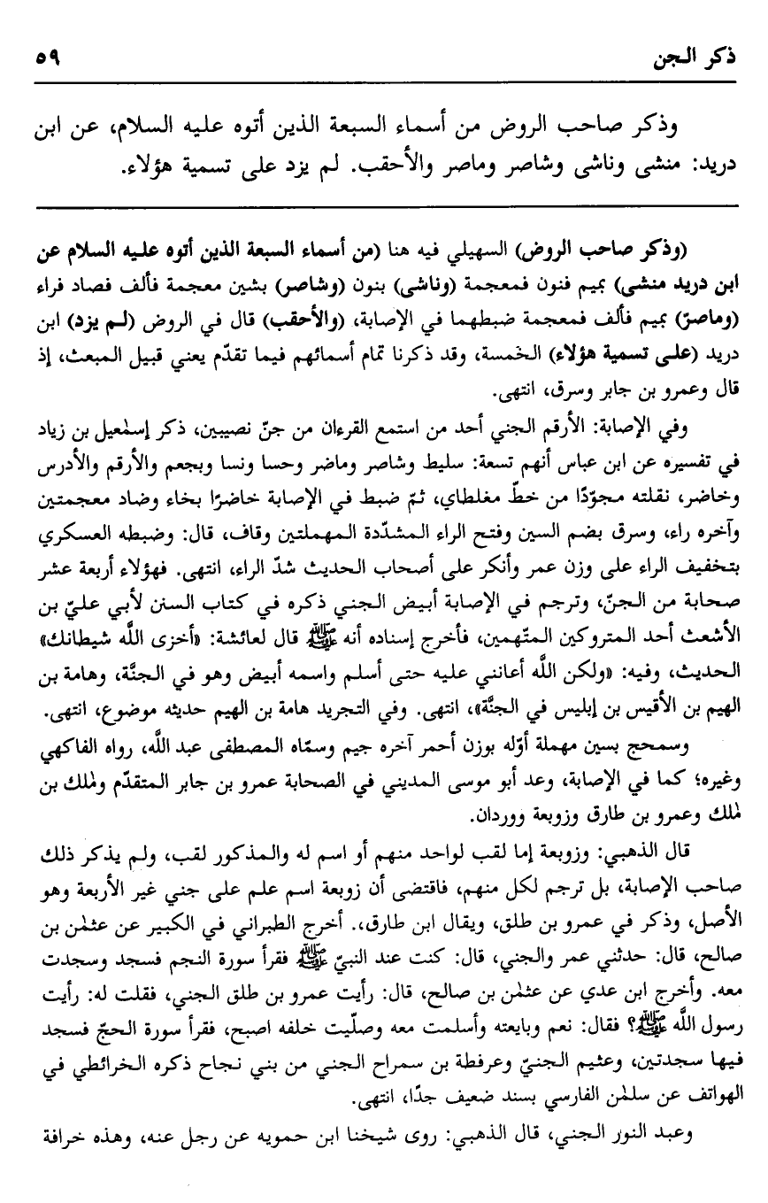 وفي الإصابة: الأرقم الجني أحد من استمع القرآن من جن نصيبين، ذكر إسماعيل بن زياد في تفسيره عن ابن عباس أنهم تسعة: سليط وشاصر وماضر وحسا ونسا وبجعم والأرقم والأدرس وخاضر، نقلته مجودا من خط مغلطاي، ثم ضبط في الإصابة خاضرا بخاء وضاد معجمتين وآخره راء، وسرق بضم السين وفتح الراء المشددة المهملتين وقاف، قال: وضبطه العسكري بتخفيف الراء على وزن عمر وأنكر على أصحاب الحديث شد الراء، انتهى. فهؤلاء أربعة عشر صحابة من الجن، وترجم في الإصابة أبيض الجني ذكره في كتاب السنن لأبي علي بن الأشعث أحد المتروكين المتهمين، فأخرج إسناده أنه صلى الله عليه وسلم قال لعائشة: "أخزى الله شيطانك" الحديث، وفيه: "ولكن الله أعانني عليه حتى أسلم واسمه أبيض وهو في الجنة، وهامة بن الهيم بن الأقيس بن إبليس في الجنة"، انتهى. وفي التجريد هامة بن الهيم حديثه موضوع، انتهى.