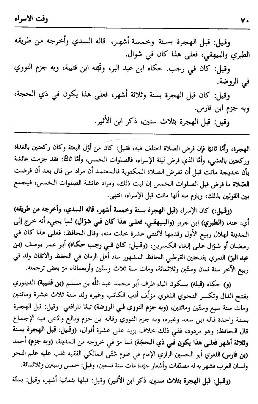 "وقيل" كان الإسراء "قبل الهجرة بسنة وخمسة أشهر، قاله السدي، وأخرجه من طريقه" أي: عنه، "الطبري" ابن جرير "والبيهقي، فعلى هذا كان في شوال" لما يجيء أنه خرج إلى المدينة لهلال ربيع الأول وقدمها لاثنتي عشرة خلت منه، وقال الحافظ: فعلى هذا كان في رمضان أو شوال على إلغاء الكسرين، "وقيل: كان في رجب حكاه" أبو عمرو يوسف "بن عبد البر" النمري بفتحتين القرطبي الحافظ المشهور ساد أهل الزمان في الحفظ والاتقان ولد في ربيع الآخر سنة ثمان وستين وثلاثمائة، ومات سنة ثلاث وستين وأربعمائة، مر بعض ترجمته.